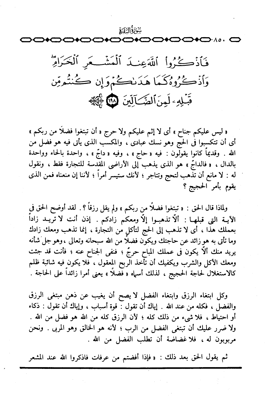 {لَيْسَ عَلَيْكُمْ جُنَاحٌ} أي لا إثم عليكم ولا حرج {أَن تَبْتَغُواْ فَضْلاً مِّن رَّبِّكُمْ} أي أن تتكسبوا في الحج وهو نسك عبادي، والمكسب الذي يأتي فيه هو فضل من الله. وقديماً كانوا يقولون: فيه «حاج» ، وفيه «داجّ» ، واحدة بالحاء وواحدة بالدال، «فالداجّ» هو الذي يذهب إلى الأراضي المقدسة للتجارة فقط، ونقول له: لا مانع أن تذهب لتحج وتتاجر؛ لأنك ستيسر أمراً؛ لأننا إن منعناه فمن الذي يقوم بأمر الحجيج؟