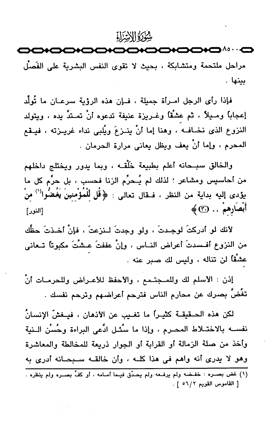 فإذا رأى الرجل امرأة جميلة، فإن هذه الرؤية سرعان ما تُولِّد إعجاباً وميلاً، ثم عِشْقاً وغريزة عنيفة تدعوه أنْ تمتدَّ يده، ويتولد النزوع الذي نخافه، وهنا إما أنْ ينزعَ ويُلبي نداء غريزته، فيقع المحرم، وإما أنْ يعف ويظل يعاني مرارة الحرمان.