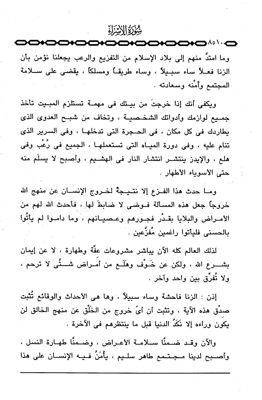 وما امتدَّ منهم إلى بلاد الإسلام من التفزيع والرعب يجعلنا نؤمن بأن الزنا فعلاً ساء سبيلاً، وساء طريقاً ومسلكاً، يقضي على سلامة المجتمع وأَمْنه وسعادته.