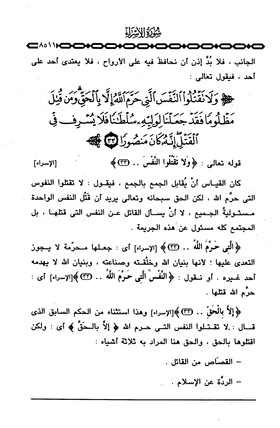 قوله تعالى: {وَلاَ تَقْتُلُواْ النفس. .} [الإسراء: 33]