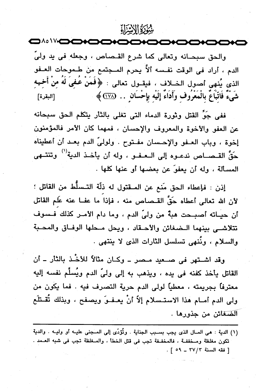 ففي جَوِّ القتل وثورة الدماء التي تغلي بالثأر يتكلم الحق سبحانه عن العفو والأخوة والمعروف والإحسان، فمهما كان الأمر فالمؤمنون إخوة، وباب العفو والإحسان مفتوح. ولوليّ الدم بعد أن أعطيناه حَقَّ القصاص ندعوه إلى العفو، وله أن يأخذ الدية وتنتهي المسألة، وله أن يعفوَ عن بعضها أو عنها كلها.
