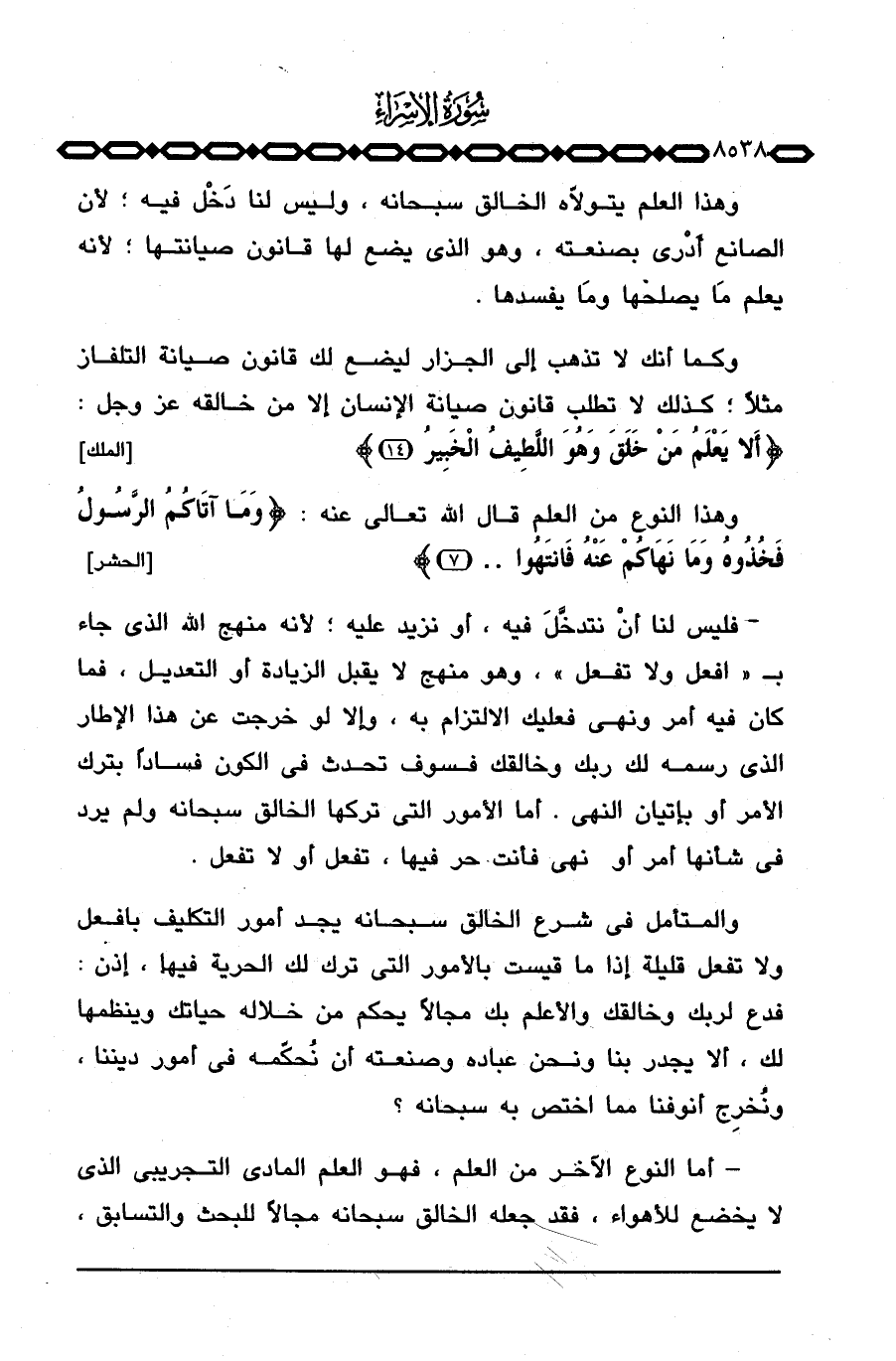 وهذا العلم يتولاّه الخالق سبحانه، وليس لنا دَخْل فيه؛ لأن الصانع أَدْرى بصنعته، وهو الذي يضع لها قانون صيانتها؛ لأنه يعلم مَا يصلحها ومَا يفسدها.
