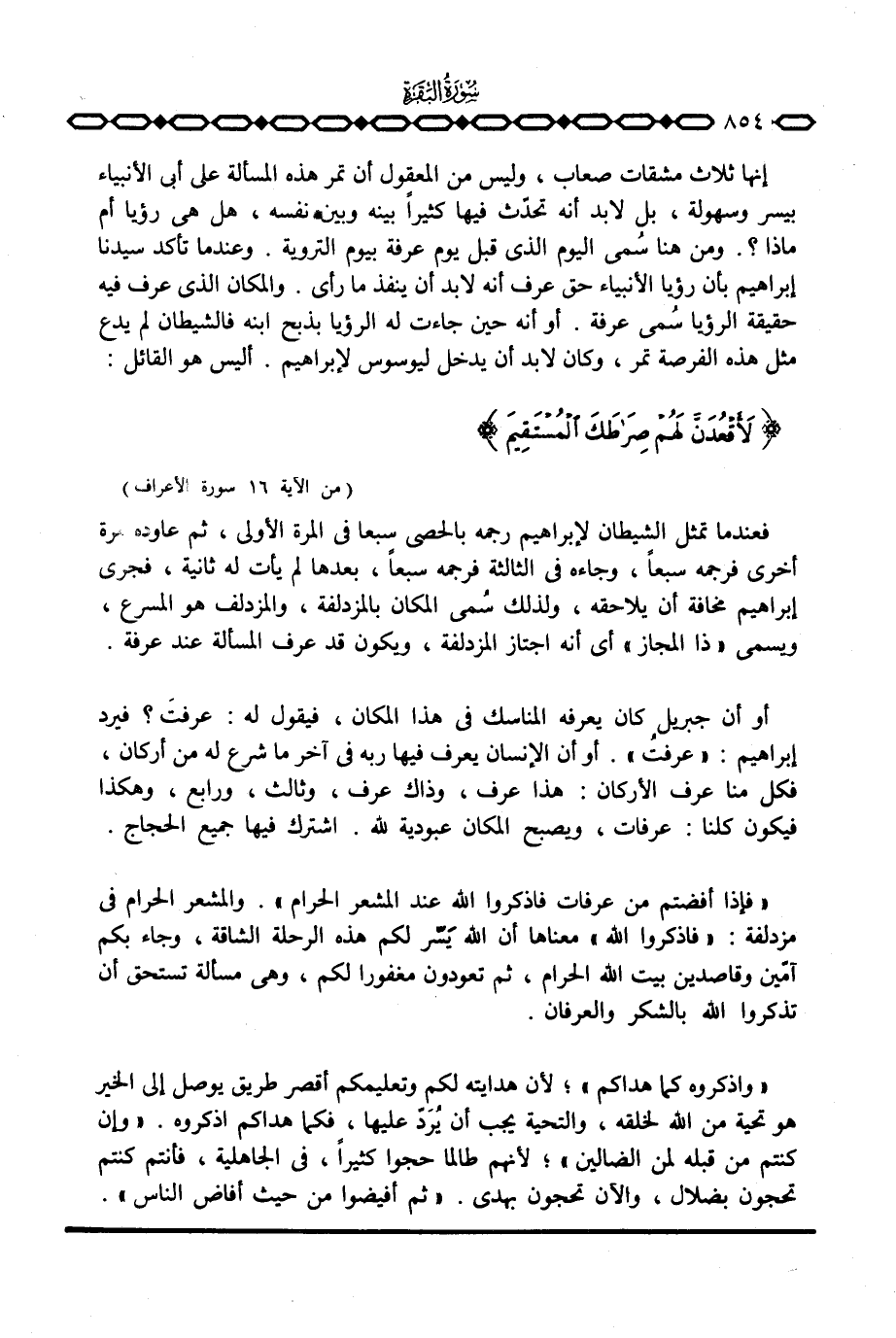 إنها ثلاث مشقات صعاب، وليس من المعقول أن تمر هذه المسألة على أبي الأنبياء بيسر وسهولة، بل لابد أنه تحدّث فيها كثيراً بينه وبين نفسه، وهل هي رؤيا أم ماذا؟ . ومن هنا سُمي اليوم الذي قبل يوم عرفة بيوم التروية. وعندما تأكد سيدنا إبراهيم بأن رؤيا الأنبياء حق عرف أنه لابد أن ينفذ ما رأى. والمكان الذي عرف فيه حقيقة الرؤيا سُمي عرفة. أو أنه حين جاءت له الرؤيا بذبح ابنه فالشيطان لم يدع مثل هذه الفرصة تمر، وكان لابد أن يدخل ليوسوس لإبراهيم. أليس هو القائل: {لأَقْعُدَنَّ لَهُمْ صِرَاطَكَ المستقيم} [الأعراف: 16]