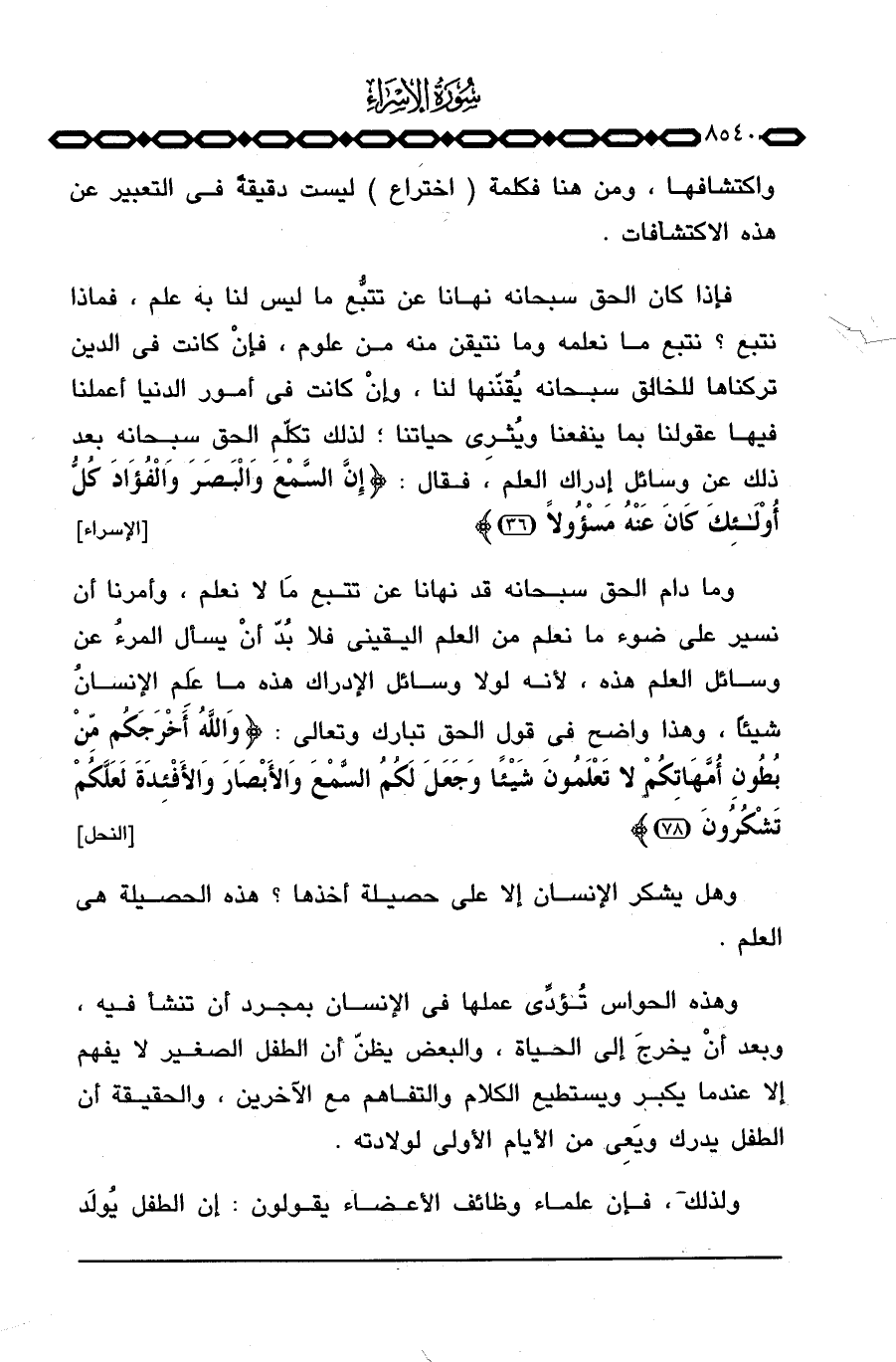 فإذا كان الحق سبحانه نهانا عن تتبُّع ما ليس لنا به علم، فماذا نتبع؟ نتبع ما نعلمه وما نتيقن منه من علوم، فإنْ كانت في الدين تركناها للخالق سبحانه يُقنّنها لنا، وإنْ كانت في أمور الدنيا أعملنا فيها عقولنا بما ينفعنا ويُثرِي حياتنا؛ لذلك تكلّم الحق سبحانه بعد ذلك عن وسائل إدراك العلم، فقال: {إِنَّ السمع والبصر والفؤاد كُلُّ أولئك كَانَ عَنْهُ مَسْؤُولاً} [الإسراء: 36]