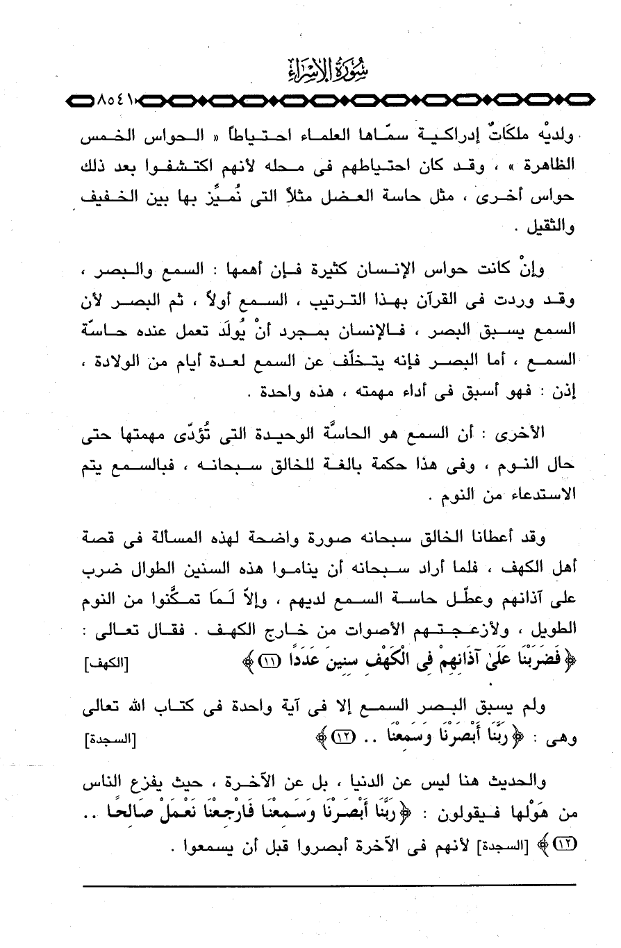 الأخرى: أن السمع هو الحاسَّة الوحيدة التي تُؤدّي مهمتها حتى حال النوم، وفي هذا حكمة بالغة للخالق سبحانه، فبالسمع يتم الاستدعاء من النوم.