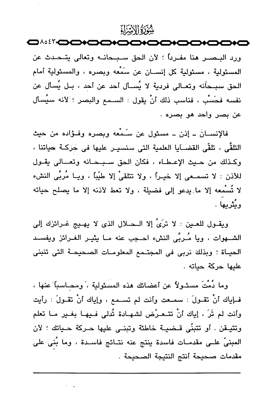 وما دُمْتَ مسئولاً عن أعضائك هذه المسئولية، ومحاسباً عنها، فإياك أنْ تقولَ: سمعت وأنت لم تسمع، وإياك أنْ تقولَ: رأيت وأنت لم تَرَ، إياك أنْ تتعرّض لشهادة تُدلي فيها بغير ما تعلم وتتيقن. أو تتبنّى قضية خاطئة وتبني عليها حركة حياتك؛ لأن المبنّي على مقدمات فاسدة ينتج عنه نتائج فاسدة، وما بُنِي على مقدمات صحيحة أنتج النتيجة الصحيحة.