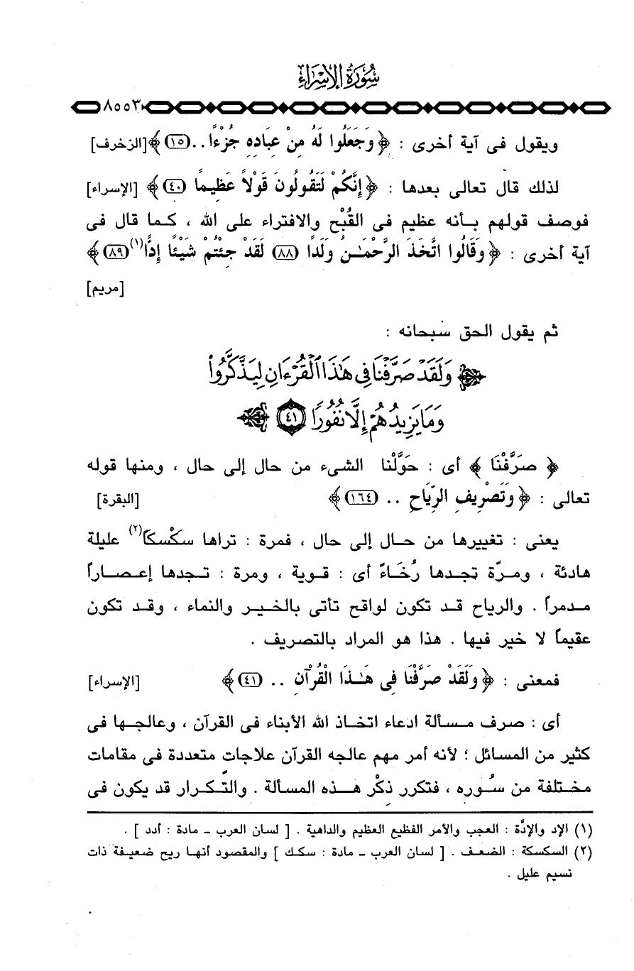 أي: صرف مسألة ادعاء اتخاذ الله الأبناء في القرآن، وعالجها في كثير من المسائل؛ لأنه أمر مهم عالجه القرآن علاجاتٍ متعددة في مقامات مختلفة من سُوره، فتكرر ذِكْر هذه المسألة. والتكرار قد يكون في
