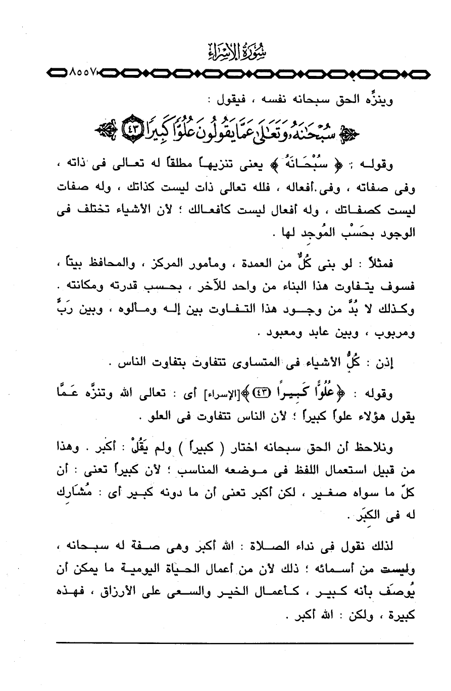 وقوله: {عُلُوّاً كَبِيراً} [الإسراء: 43] أي: تعالى الله وتنزَّه عَمَّا يقول هؤلاء علواً كبيراً؛ لأن الناس تتفاوت في العلو.