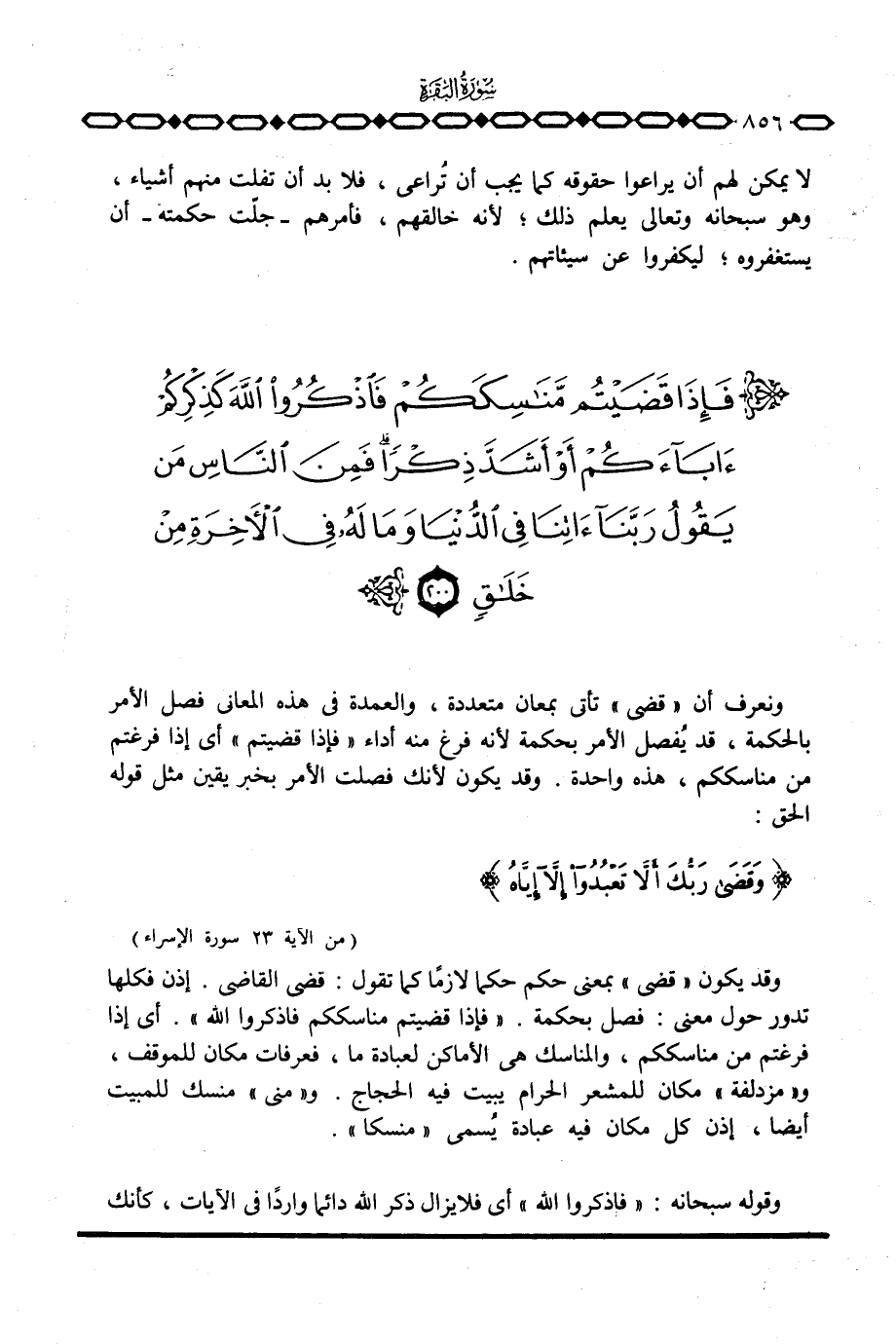 وقد يكون «قضى» بمعنى حكم حكما لازماً كما تقول: قضى القاضي. إذن فكلها تدور حول معنى: فصل بحكمة. {فَإِذَا قَضَيْتُمْ مَّنَاسِكَكُمْ فاذكروا الله} . أي إذا فرغتم من مناسككم، والمناسك هي الأماكن لعبادة ما، فعرفات مكان للموقف، و «مزدلفة» مكان للمشعر الحرام يبيت فيه الحجاج. و «منى» منسك للمبيت أيضا، إذن كل مكان فيه عبادة يُسمى «منسكا» .