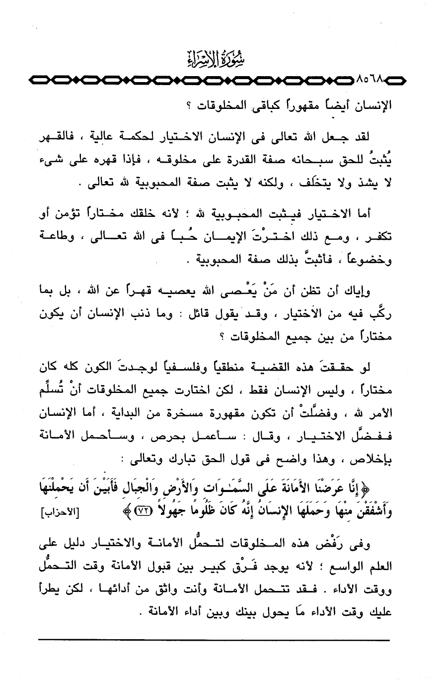لقد جعل الله تعالى في الإنسان الاختيار لحكمة عالية، فالقهر يُثبتُ للحق سبحانه صفة القدرة على مخلوقه، فإذا قهره على شيء لا يشذ ولا يتخَلف، ولكنه لا يثبت صفة المحبوبية لله تعالى.