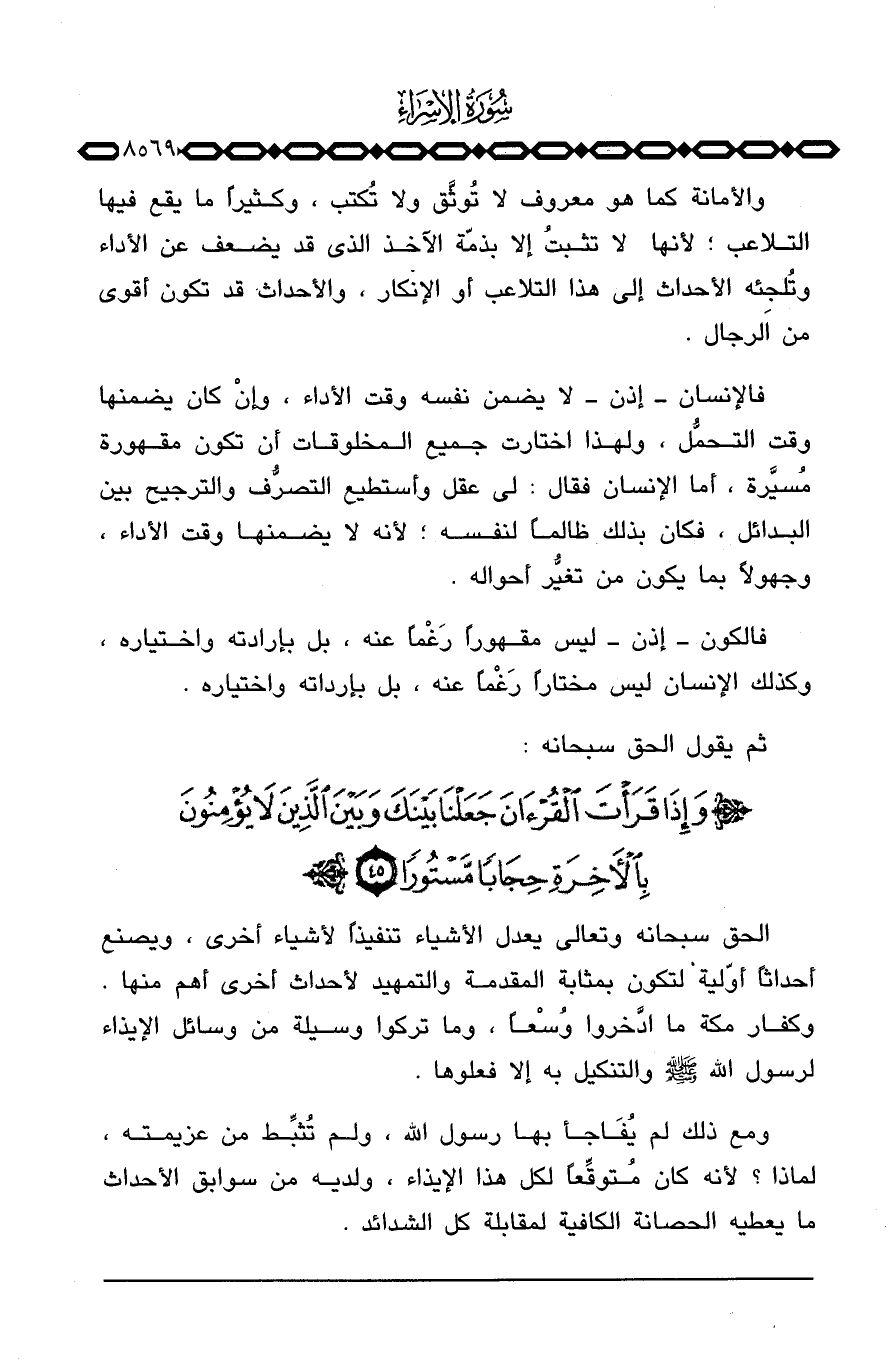 فالإنسان إذن لا يضمن نفسه وقت الأداء، وإنْ كان يضمنها وقت التحمُّل، ولهذا اختارت جميع المخلوقات أن تكون مقهورة مُسيَّرة، أما الإنسان فقال: لي عقل وأستطيع التصرُّف والترجيح بين البدائل، فكان بذلك ظالماً لنفسه؛ لأنه لا يضمنها وقت الأداء، وجهولاً بما يكون من تغيُّر أحواله.