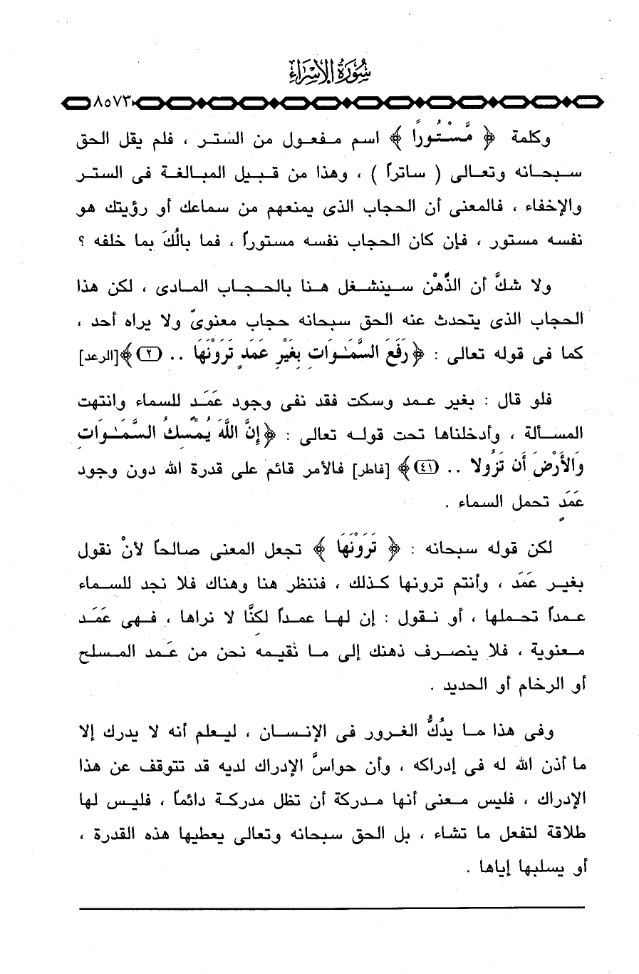 وكلمة {مَّسْتُوراً} اسم مفعول من الستر، فلم يقل الحق سبحانه وتعالى (ساتراً) ، وهذا من قبيل المبالغة في الستر والإخفاء، فالمعنى أن الحجاب الذي يمنعهم من سماعك أو رؤيتك هو نفسه مستور، فإن كان الحجاب نفسه مستوراً، فما بالُكَ بما خلفه؟