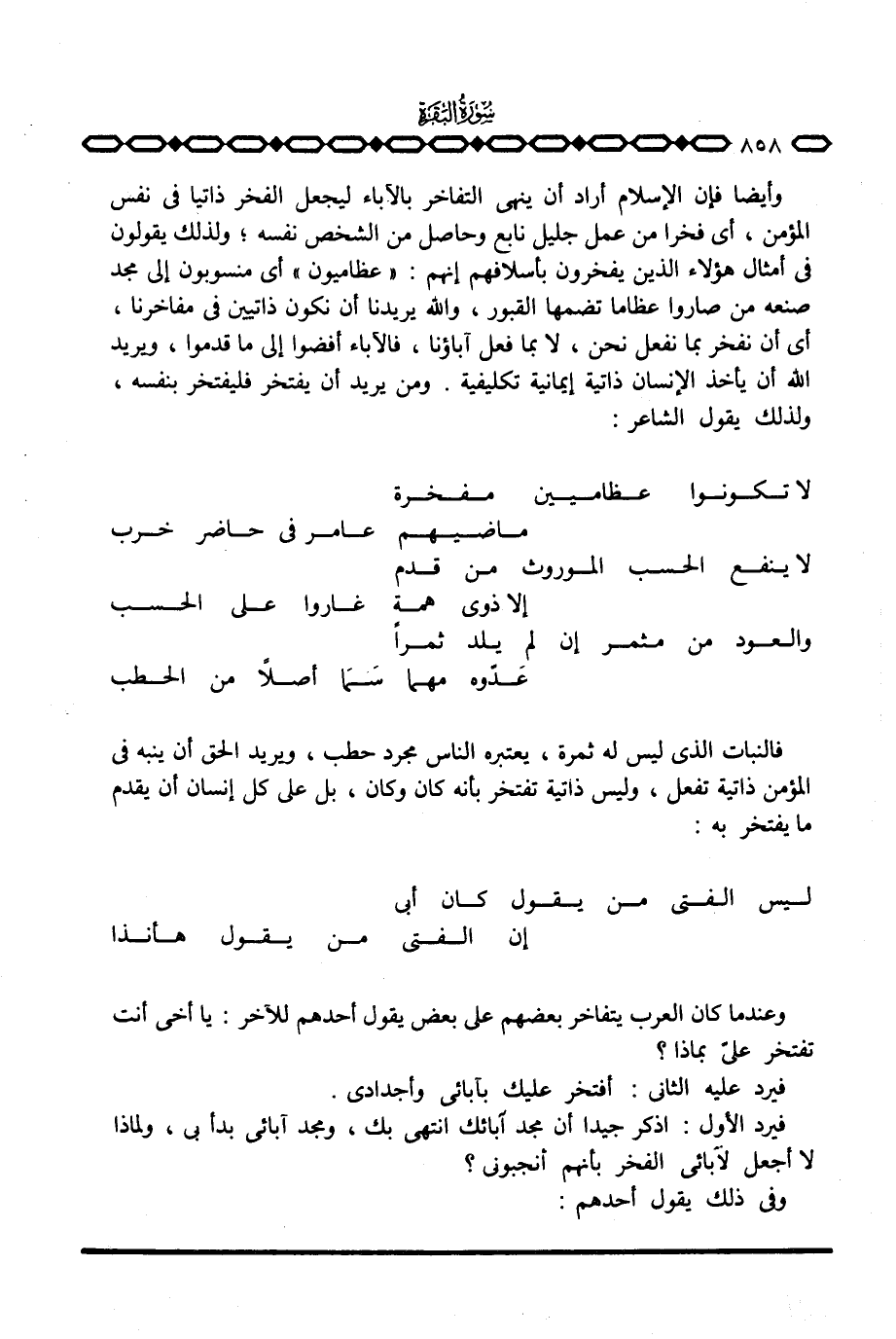 وأيضاً فإن الإسلام أراد أن ينهي التفاخر بالآباء ليجعل الفخر ذاتيا في نفس المؤمن، أي فخراً من عمل جليل نابع وحاصل من الشخص نفسه؛ ولذلك يقولون في أمثال هؤلاء الذين يفخرون بأسلافهم إنهم: «عظاميون» أي منسوبون إلى مجد صنعه من صاروا عظاما تضمها القبور، والله يريدنا أن نكون ذاتيين في مفاخرنا، أي أن نفخر بما نفعل نحن، لا بما فعل آباؤنا، فالآباء أفضوا إلى ما قدموا، ويريد الله أن يأخذ الإنسان ذاتية إيمانية تكليفية. ومن يريد أن يفتخر فليفتخر بنفسه ولذلك يقول الشاعر: