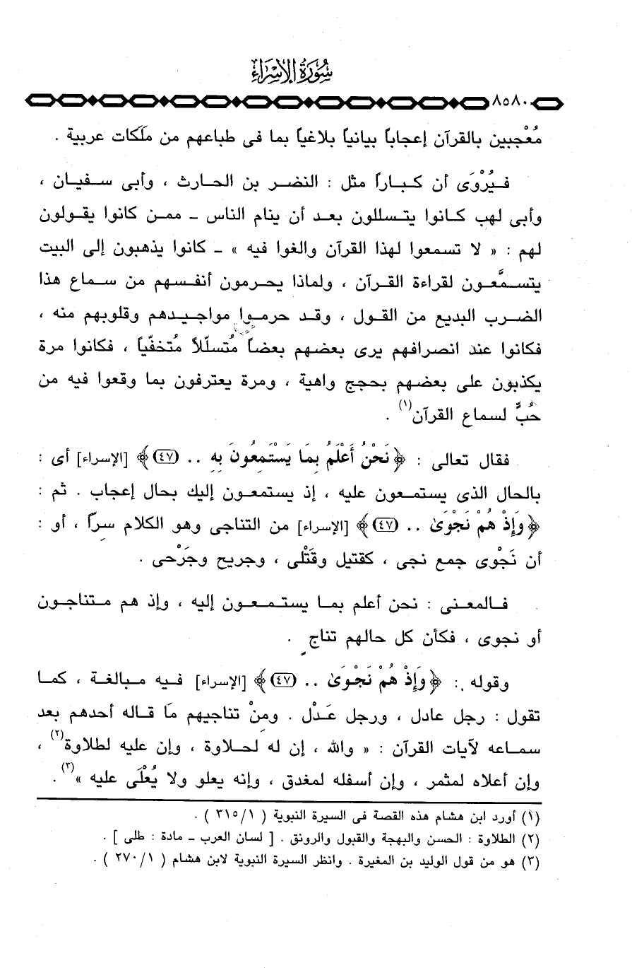 ومِنْ تناجيهم مَا قاله أحدهم بعد سماعه لآيات القرآن: «والله، إن له لحلاوة، وإن عليه لطلاوة، وإن أعلاه لمثمر، وإن أسلفه لمغدق، وإنه يعلو ولا يُعْلَى عليه» .