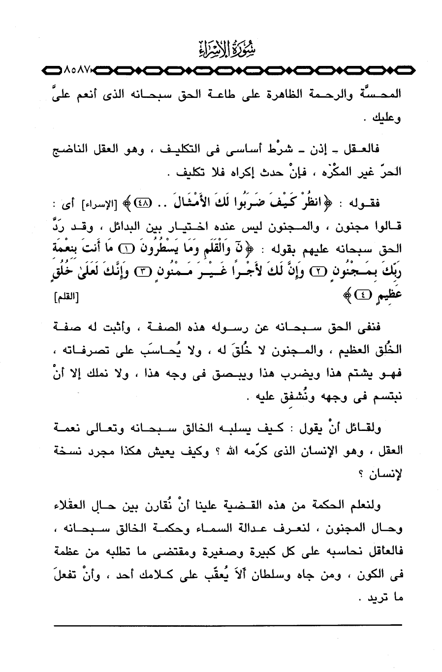 فنفى الحق سبحانه عن رسوله هذه الصفة، وأثبت له صفة الخُلق العظيم، والمجنون لا خُلقَ له، ولا يُحاسَب على تصرفاته، فهو يشتم هذا ويضرب هذا ويبصق في وجه هذا، ولا نملك إلا أنْ نبتسم في وجهه ونُشفِق عليه.