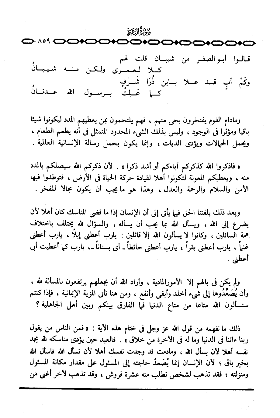 وما دام القوم يفتخرون بحي منهم، فهم يلتحمون بمن يعطيهم المدد ليكونوا شيئا باقياً ومؤثراً في الوجود، وليس بذلك الشيء المحدود المتمثل في أنه يطعم الطعام، ويحمل الحمالات ويؤدي الديات، وإنما يكون بحمل رسالة الإنسانية العالمية.