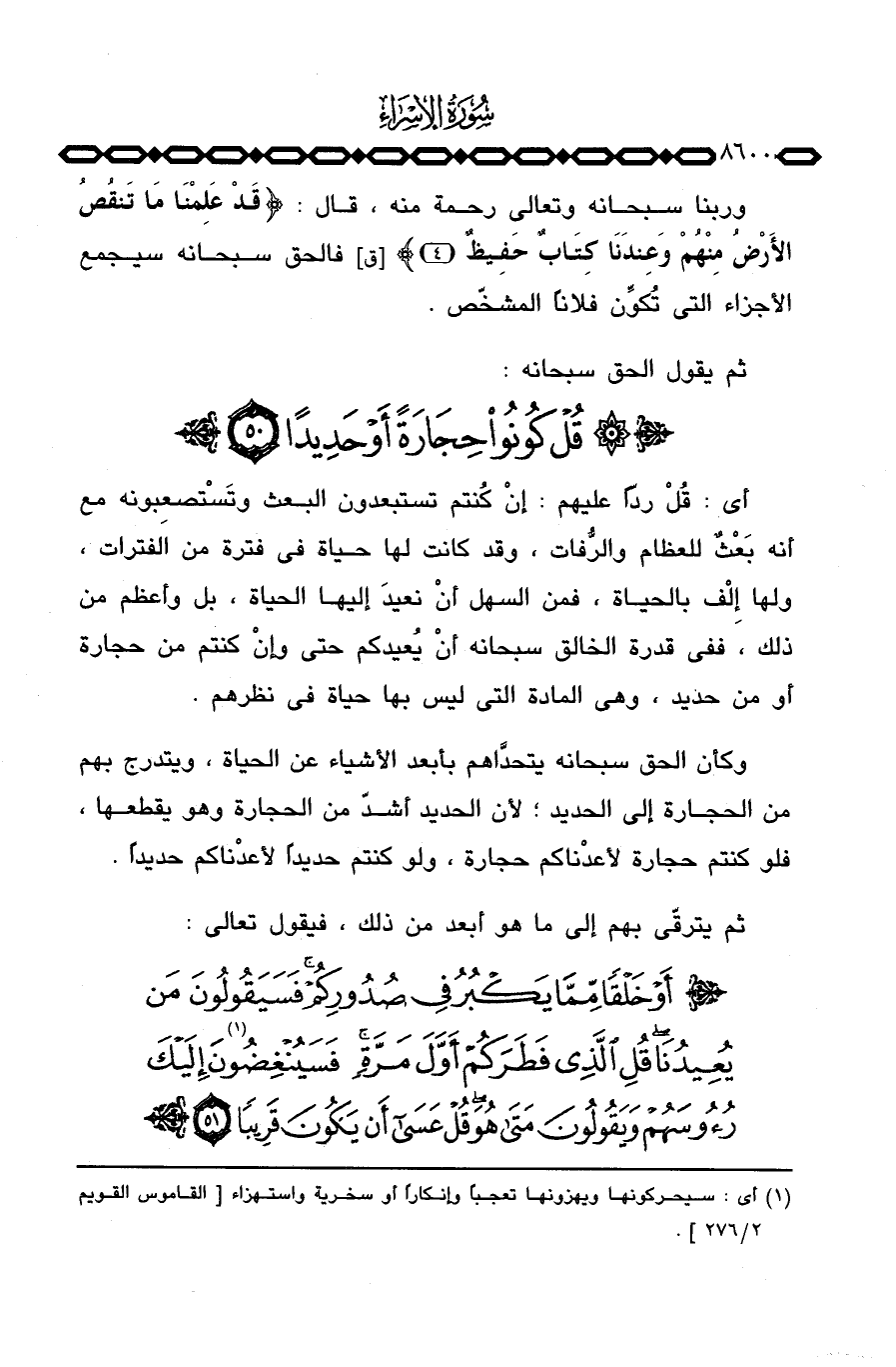 وكأن الحق سبحانه يتحدَّاهم بأبعد الأشياء عن الحياة، ويتدرج بهم من الحجارة إلى الحديد؛ لأن الحديد أشدّ من الحجارة وهو يقطعها، فلو كنتم حجارة لأعدْناكم حجارة، ولو كنتم حديداً لأعدْناكم حديداً.