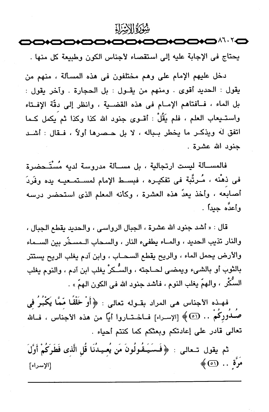 دخل عليهم الإمام علي وهم مختلفون في هذه المسألة، منهم من يقول: الحديد أقوى. ومنهم من يقول: بل الحجارة. وآخر يقول: بل الماء، فأفتاهم الإمام في هذه القضية، وانظر إلى دِقّة الإفتاء واستيعاب العلم، فلم يَقُل: أقوى جنود الله كذا وكذا ثم يكمل كما اتفق له ويذكر ما يخطر بباله، لا بل حصرها أولاً، فقال: أشد جنود الله عشرة.