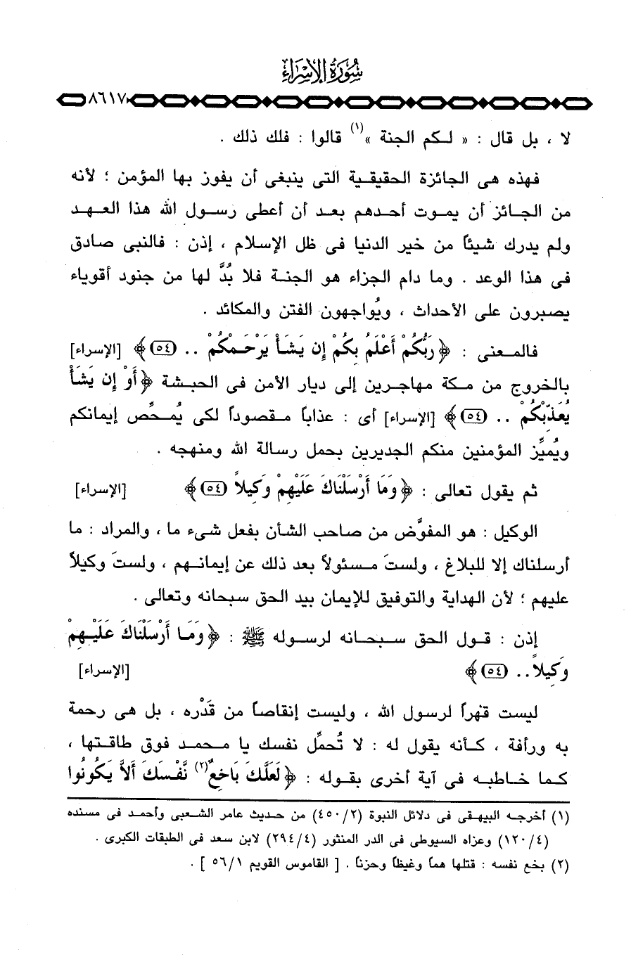 فالمعنى: {رَّبُّكُمْ أَعْلَمُ بِكُمْ إِن يَشَأْ يَرْحَمْكُمْ} [الإسراء: 54] بالخروج من مكة مهاجرين إلى ديار الأمن في الحبشة {أَوْ إِن يَشَأْ يُعَذِّبْكُمْ. .} [الإسراء: 54] أي: عذاباً مقصوداً لكي يُمحِّص إيمانكم ويُميِّز المؤمنين منكم الجديرين بحمل رسالة الله ومنهجه.