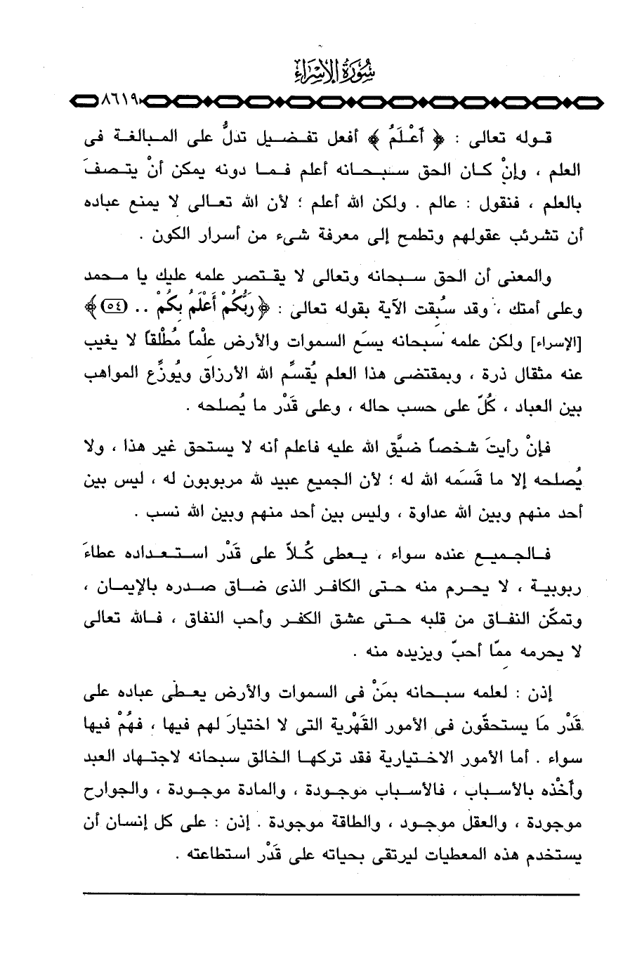 والمعنى أن الحق سبحانه وتعالى لا يقتصر علمه عليك يا محمد وعلى أمتك، وقد سُبِقت الآية بقوله تعالى: {رَّبُّكُمْ أَعْلَمُ بِكُمْ. .} [الإسراء: 54] ولكن علمه سبحانه يسَع السماوات والأرض عِلْماً مُطْلقاً لا يغيب عنه مثقال ذرة، وبمقتضى هذا العلم يُقسِّم الله الأرزاق ويُوزِّع المواهب بين العباد، كُلّ على حسب حاله، وعلى قَدْر ما يُصلحه.