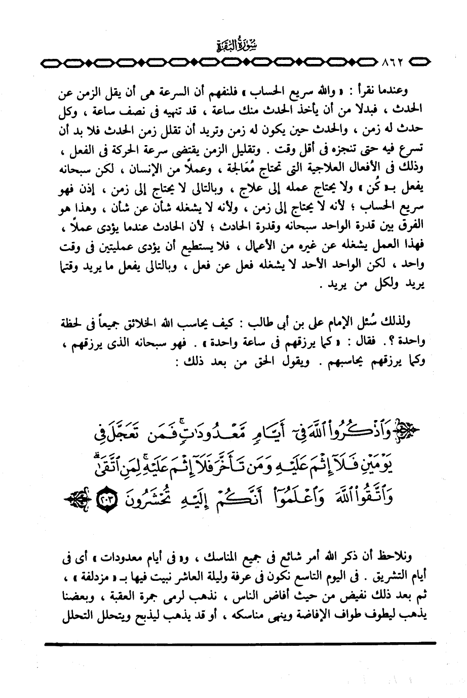 ولذلك سُئل الإمام علي بن أبي طالب: كيف يحاسب الله الخلائق جميعاً في لحظة واحدة؟ . فقال: «كما يرزقهم في ساعة واحدة» . فهو سبحانه الذي يرزقهم، وكما يرزقهم يحاسبهم. ويقول الحق من بعد ذلك: {واذكروا الله في أَيَّامٍ مَّعْدُودَاتٍ ... }