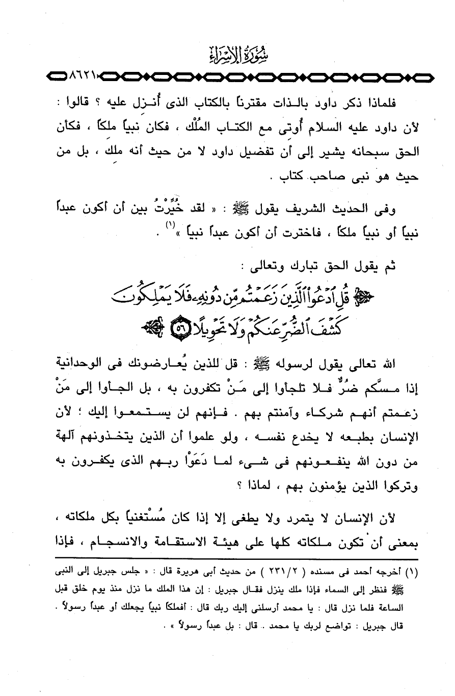 وفي الحديث الشريف يقول صَلَّى اللَّهُ عَلَيْهِ وَسَلَّم َ: «لقد خُيِّرْتُ بين أن أكون عبداً نبياً أو نبياً ملكاً، فاخترت أن أكون عبداً نبياً» .