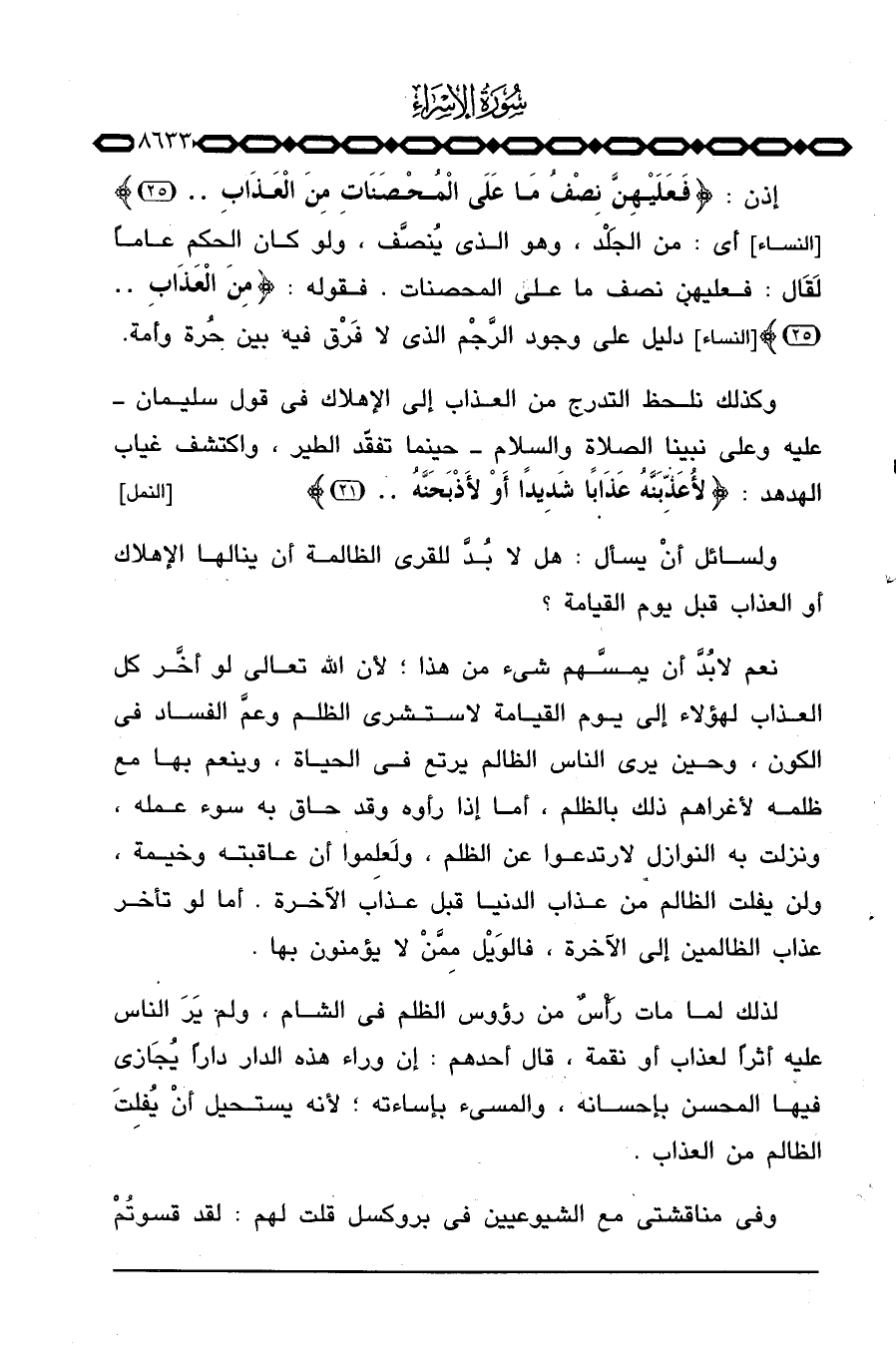 إذن: {فَعَلَيْهِنَّ نِصْفُ مَا عَلَى المحصنات مِنَ العذاب. .} [النساء: 25] أي: من الجَلْد، وهو الذي يُنصَّف، ولو كان الحكم عاماً لَقَال: فعليهن نصف ما على المحصنات. فقوله: {مِنَ العذاب. .} [النساء: 25] دليل على وجود الرَّجْم الذي لا فَرْق فيه بين حُرة وأمة.