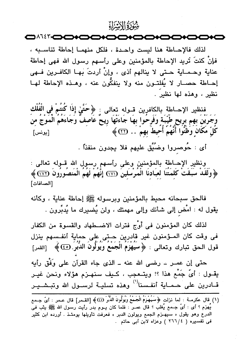 ونظير الإحاطة بالمؤمنين وعلى رأسهم رسول الله قوله تعالى: {وَلَقَدْ سَبَقَتْ كَلِمَتُنَا لِعِبَادِنَا المرسلين إِنَّهُمْ لَهُمُ المنصورون} [الصافات: 171 - 172]