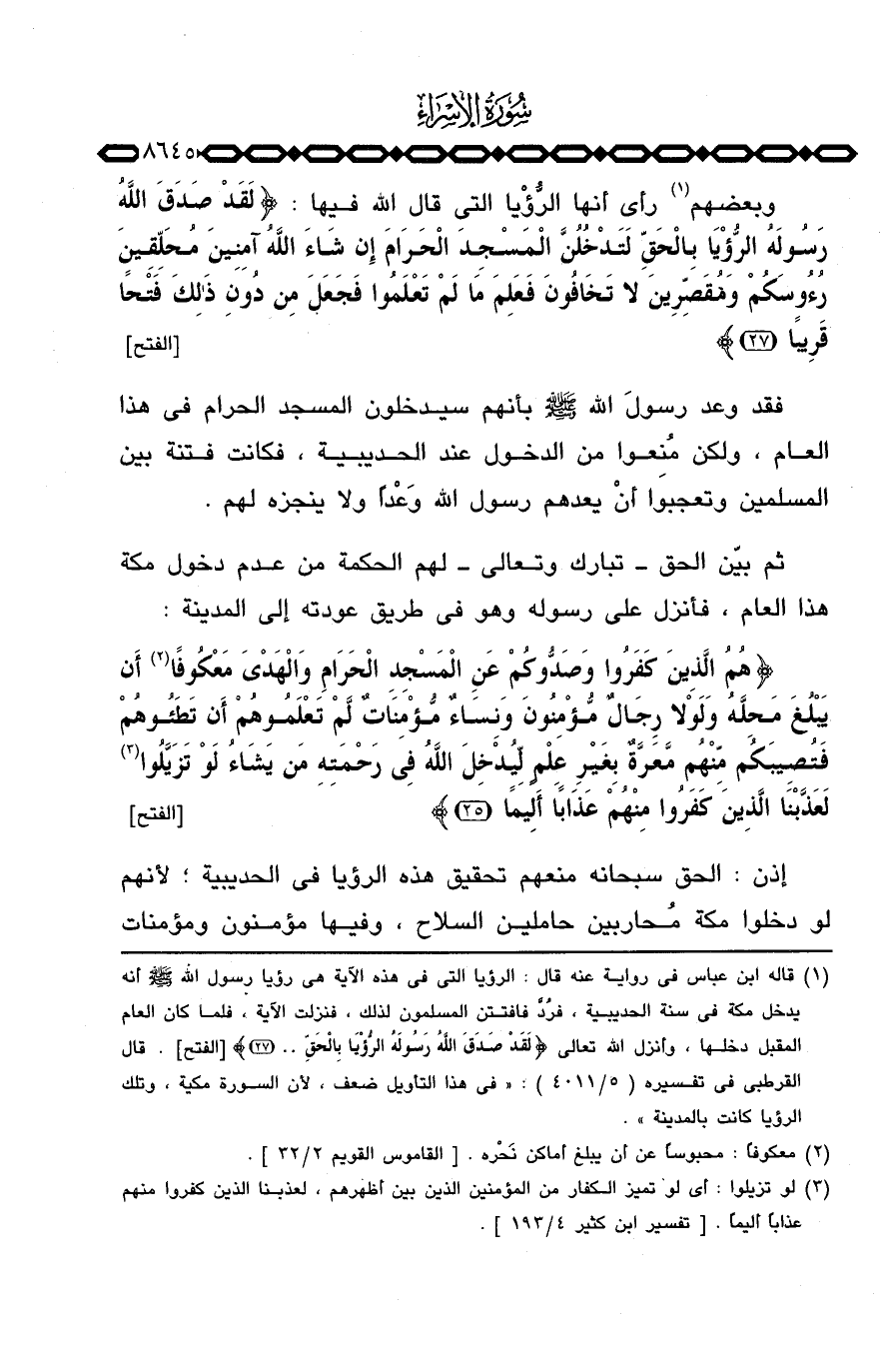 وبعضهم رأى أنها الرُّؤْيا التي قال الله فيها: {لَّقَدْ صَدَقَ الله رَسُولَهُ الرءيا بالحق لَتَدْخُلُنَّ المسجد الحرام إِن شَآءَ الله آمِنِينَ مُحَلِّقِينَ رُءُوسَكُمْ وَمُقَصِّرِينَ لاَ تَخَافُونَ فَعَلِمَ مَا لَمْ تَعْلَمُواْ فَجَعَلَ مِن دُونِ ذَلِكَ فَتْحاً قَرِيباً} [الفتح: 27]