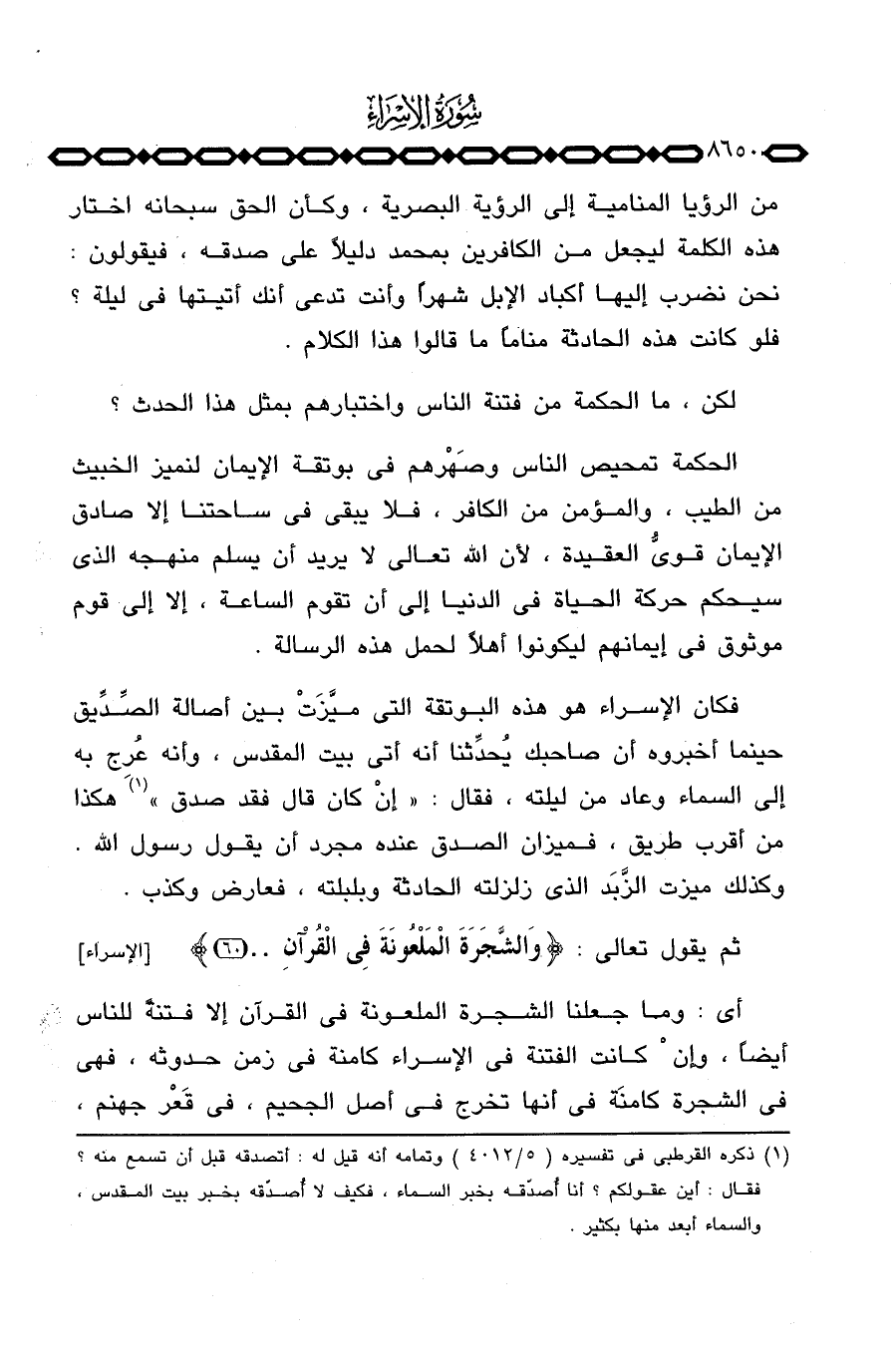 من الرؤيا المنامية إلى الرؤية البصرية، وكأن الحق سبحانه اختار هذه الكلمة ليجعل من الكافرين بمحمد دليلاً على صدقه، فيقولون: نحن نضرب إليها أكباد الإبل شهراً وأنت تدعي أنك أتيتها في ليلة؟ فلو كانت هذه الحادثة مناماً ما قالوا هذا الكلام.
