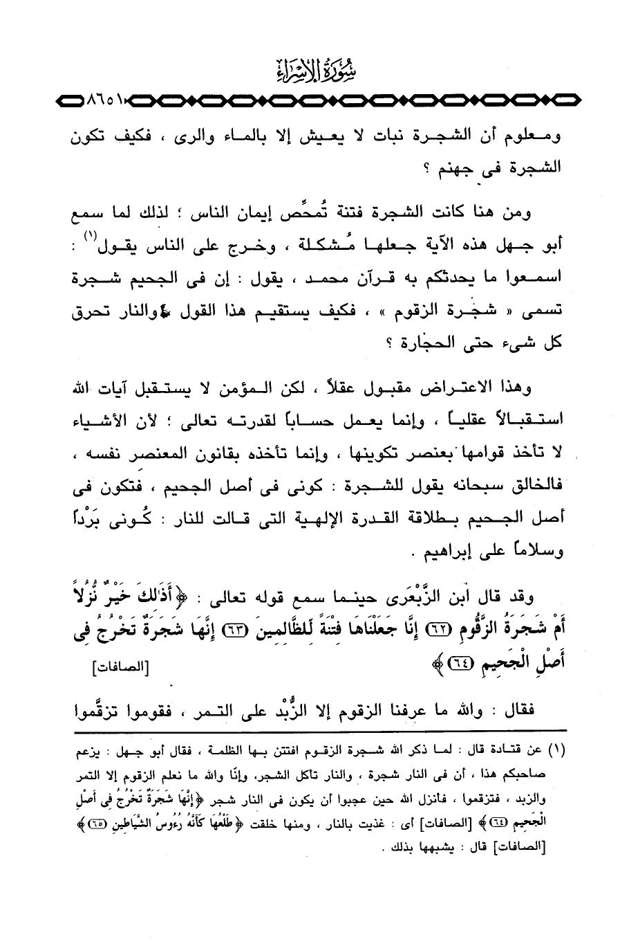 وقد قال ابن الزَّبْعَري حينما سمع قوله تعالى: {أَذَلِكَ خَيْرٌ نُّزُلاً أَمْ شَجَرَةُ الزقوم إِنَّا جَعَلْنَاهَا فِتْنَةً لِّلظَّالِمِينَ إِنَّهَا شَجَرَةٌ تَخْرُجُ في أَصْلِ الجحيم} [الصافات: 62 - 64]