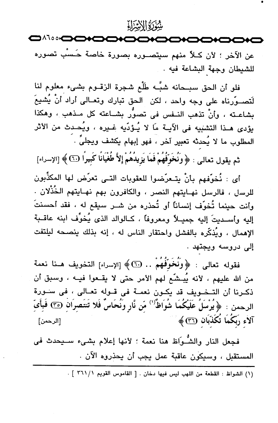 فقوله تعالى: {وَنُخَوِّفُهُمْ. .} [الإسراء: 60] التخويف هنا نعمة من الله عليهم، لأنه يُبشّع لهم الأمر حتى لا يقعوا فيه، وسبق أن ذكرنا أن التخويف قد يكون نعمة في قوله تعالى، في سورة الرحمن:
