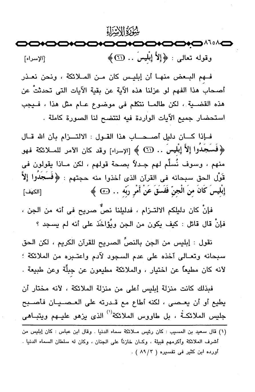 فهِم البعض منها أن إبليس كان من الملائكة، ونحن نعذر أصحاب هذا الفهم لو عزلنا هذه الآية عن بقية الآيات التي تحدثتْ عن هذه القضية، لكن طالما نتكلم في موضوع عام مثل هذا، فيجب استحضار جميع الآيات الواردة فيه لتتضح لنا الصورة كاملة.