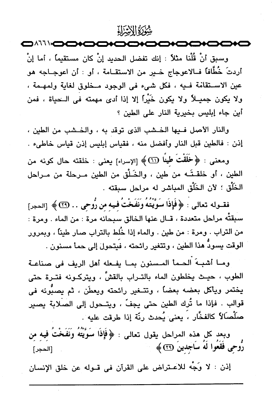 وسبق أنْ قُلْنا مثلاً: إنك تفضل الحديد إنْ كان مستقيماً، أما إنْ أردتَ خُطَّافاً فالاعوجاج خير من الاستقامة، أو: أن اعوجاجه هو عين الاستقامة فيه، فكل شيء في الوجود مخلوق لغاية ولمهمة ولا يكون جميلاً ولا يكون خَيْراً إلا إذا أدى مهمته في الحياة، فمن أين جاء إبليس بخيرية النار على الطين؟
