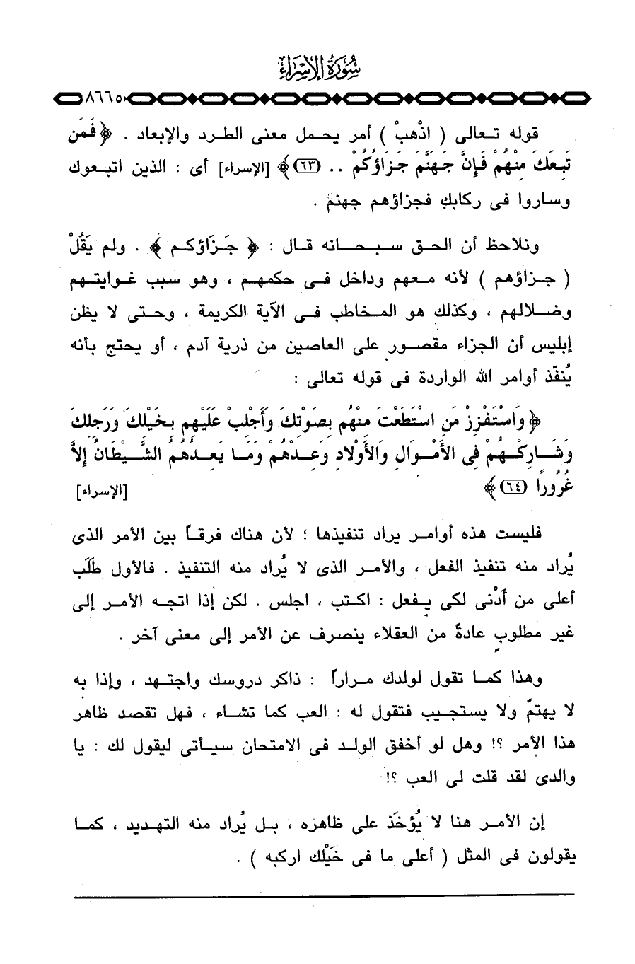 ونلاحظ أن الحق سبحانه قال: {جَزَآؤُكُمْ} . ولم يقل (جزاؤهم) لأنه معهم وداخل في حكمهم، وهو سبب غوايتهم وضلالهم، وكذلك هو المخاطب في الآية الكريمة، وحتى لا يظن إبليس أن الجزاء مقصور على العاصين من ذرية آدم، أو يحتج بأنه يُنفّذ أوامر الله الواردة في قوله تعالى: {واستفزز مَنِ استطعت مِنْهُمْ بِصَوْتِكَ وَأَجْلِبْ عَلَيْهِم بِخَيْلِكَ وَرَجِلِكَ وَشَارِكْهُمْ فِي الأموال والأولاد وَعِدْهُمْ وَمَا يَعِدُهُمُ الشيطان إِلاَّ غُرُوراً} [الإسراء: 64]
