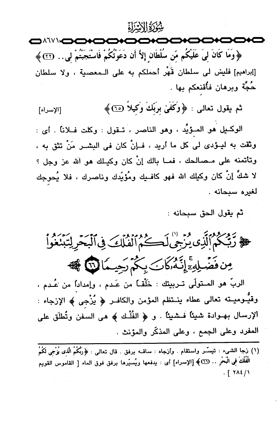 الربّ هو المتولّي تربيتك: خَلْقاً من عَدم، وإمداداً من عُدم، وقيُّوميته تعالى عطاء ينتظم المؤمن والكافر {يُزْجِي} الإزجاء: الإرسال بهوادة شيئاً فشيئاً. و {الفلك} هي السفن وتُطلَق على المفرد وعلى الجمع، وعلى المذكّر والمؤنث.