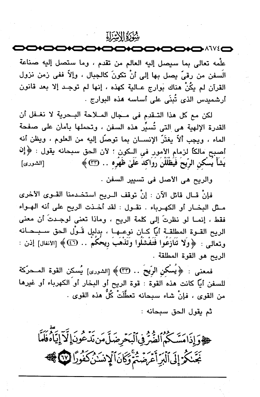 لكن مع كل هذا التقدم في مجال الملاحة البحرية لا نغفل أن القدرة الإلهية هي التي تُسيِّر هذه السفن، وتحملها بأمان على صفحة الماء، ويجب أَلاّ يغتَرّ الإنسان بما توصّل إليه من العلوم، ويظن أنه أصبح مالكاً لزمام الأمور في الكون؛ لأن الحق سبحانه يقول: {إِن يَشَأْ يُسْكِنِ الريح فَيَظْلَلْنَ رَوَاكِدَ على ظَهْرِهِ} [الشورى: 33]
