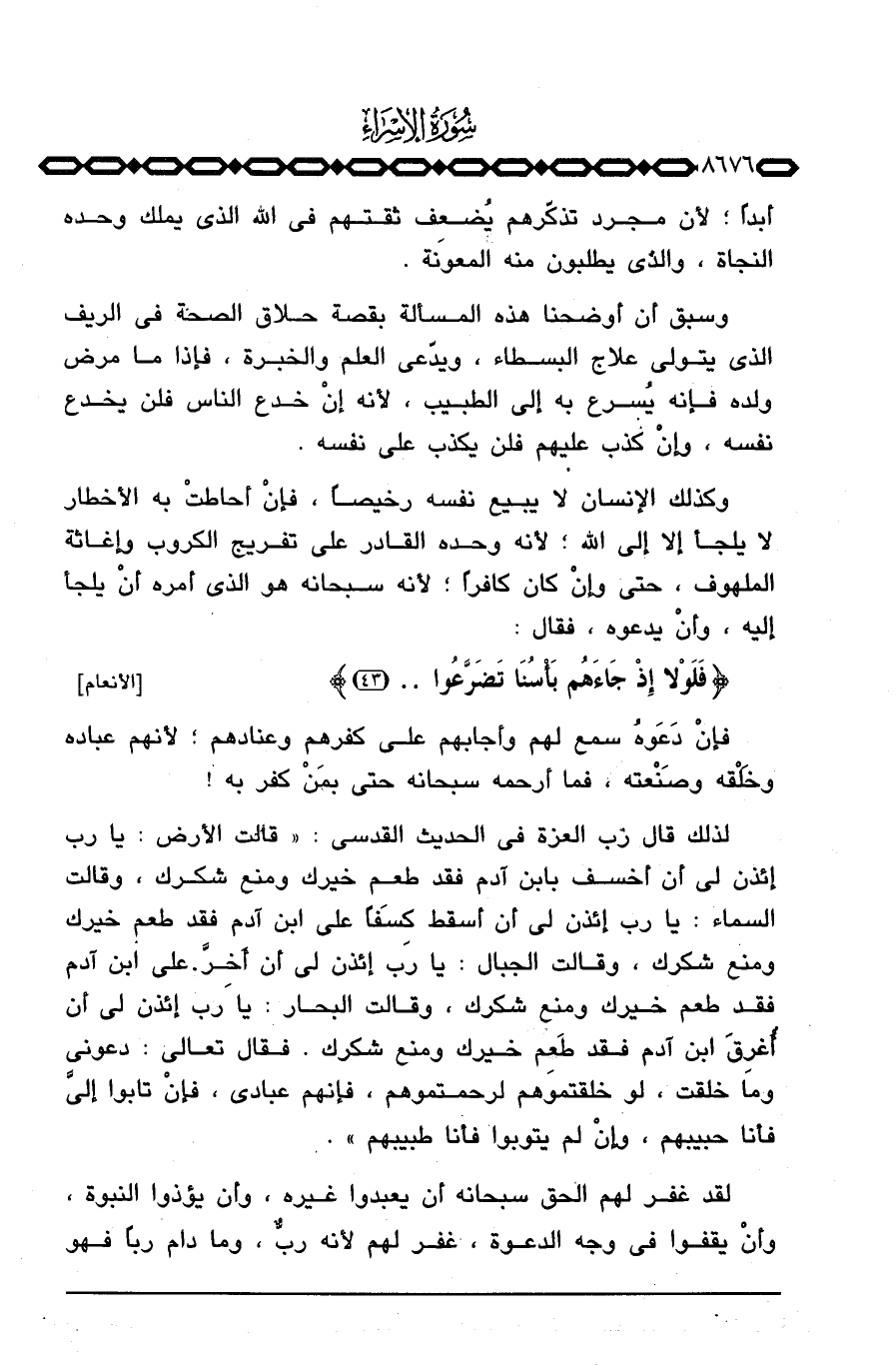 لذلك قال رب العزة في الحديث القدسي: «قالت الأرض: يا رب إئذن لي أن أخسف بابن آدم فقد طعم خيرك ومنع شكرك، وقالت السماء: يا رب إئذن لي أن أسقط كِسَفاً على ابن آدم فقد طعم خيرك ومنع شكرك، وقالت الجبال: يا رب إئذن لي أن أَخِرَّ على ابن آدم فقد طعم خيرك ومنع شكرك، وقالت البحار: يا رب إئذن لي أن أُغرِقَ ابن آدم فقد طَعِم خيرك ومنع شكرك. فقال تعالى: دعوني وما خلقت، لو خلقتموهم لرحمتموهم، فإنهم عبادي، فإنْ تابوا إليَّ فأنا حبيبهم، وإنْ لم يتوبوا فأنا طبيبهم» .