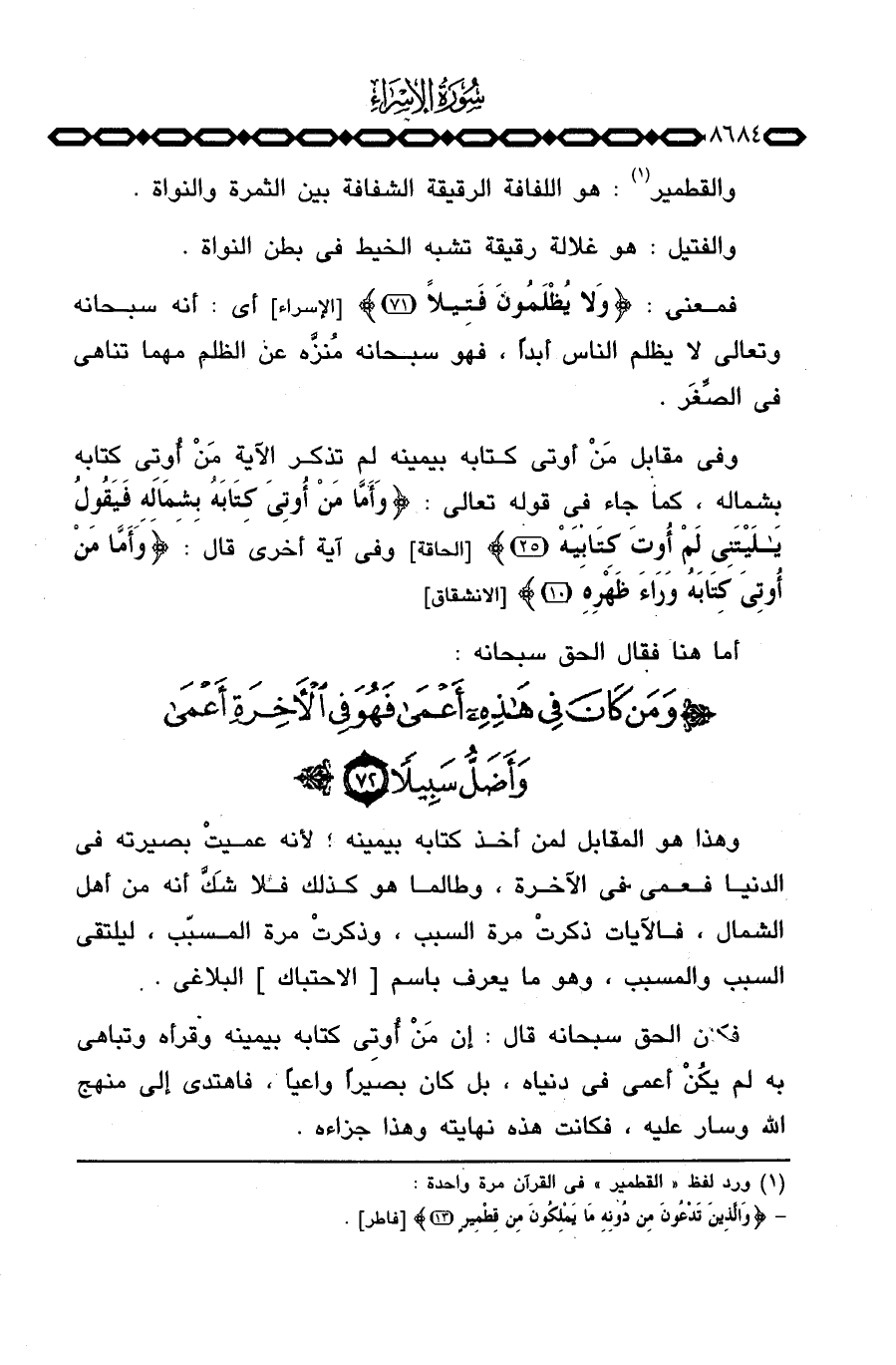 فمعنى: {وَلاَ يُظْلَمُونَ فَتِيلاً} [الإسراء: 71] أي: أنه سبحانه وتعالى لا يظلم الناس أبداً، فهو سبحانه مُنزَّه عن الظلم مهما تناهى في الصِّغَر.