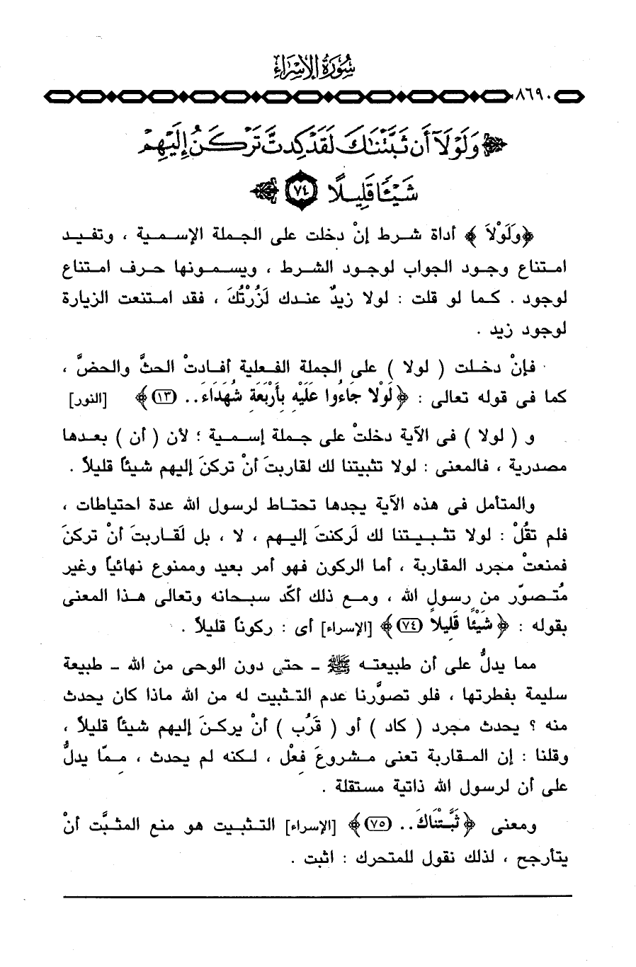 والمتأمل في هذه الآية يجدها تحتاط لرسول الله عدة احتياطات، فلم تقُلْ: لولا تثبتنا لك لَركنتَ إليهم، لا، بل لَقاربتَ أنْ تركنَ فمنعتْ مجرد المقاربة، أما الركون فهو أمر بعيد وممنوع نهائياً وغير مُتصوّر من رسول الله، ومع ذلك أكّد سبحانه وتعالى هذا المعنى بقوله: {شَيْئاً قَلِيلاً} [الإسراء: 74] أي: ركوناً قليلاً.