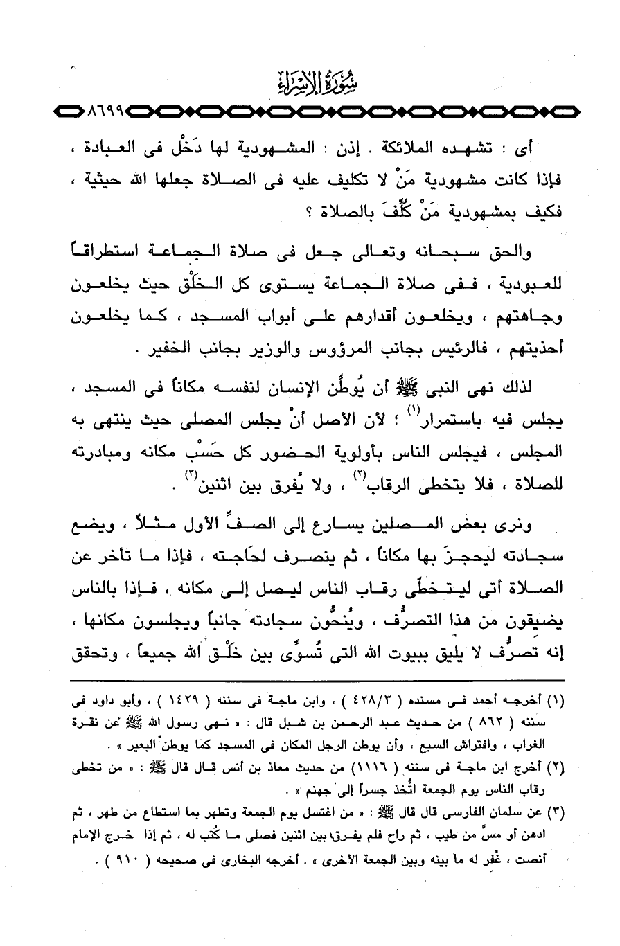 لذلك نهى النبي صَلَّى اللَّهُ عَلَيْهِ وَسَلَّم َ أن يُوطِّن الإنسان لنفسه مكاناً في المسجد، يجلس فيه باستمرار؛ لأن الأصل أنْ يجلس المصلي حيث ينتهي به المجلس، فيجلس الناس بأولوية الحضور كل حَسْب مكانه ومبادرته للصلاة، فلا يتخطى الرقاب، ولا يُفرق بين اثنين.
