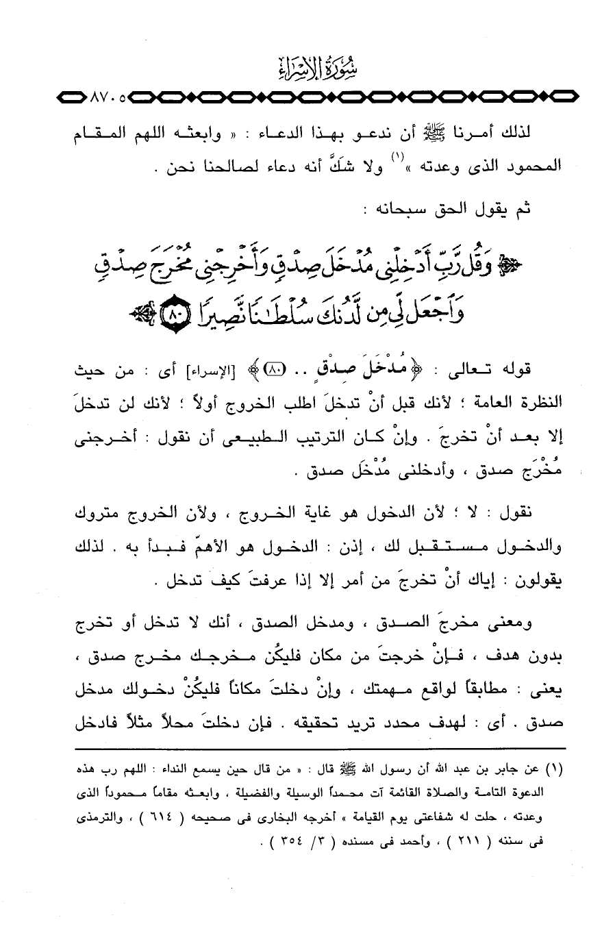 قوله تعالى: {مُدْخَلَ صِدْقٍ. .} [الإسراء: 80] أي: من حيث النظرة العامة؛ لأنك قبل أنْ تدخلَ اطلب الخروج أولاً؛ لأنك لن تدخلَ إلا بعد أنْ تخرجَ. وإنْ كان الترتيب الطبيعي أن تقول: أخرجني مُخْرَج صدق، وأدخلني مُدْخَل صدق.