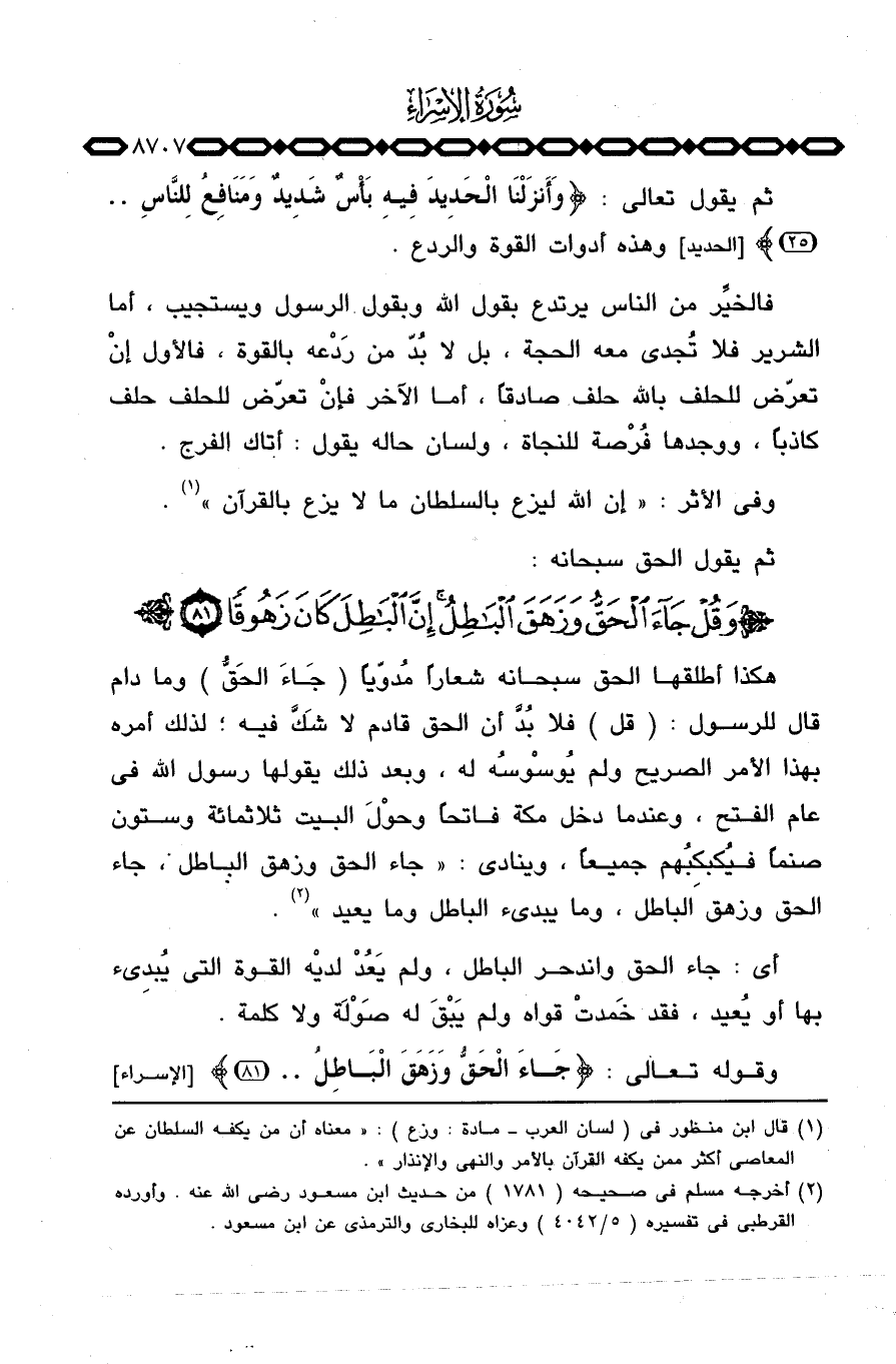 هكذا أطلقها الحق سبحانه شعاراً مُدوّياً {جَاءَ الحَقُّ. .} وما دام قال للرسول: {قُلْ} فلا بُدَّ أن الحق قادم لا شَكَّ فيه؛ لذلك أمره بهذه الأمر الصريح ولم يُوسْوسُه له، وبعد ذلك يقولها رسول الله في عام الفتح، وعندما دخل مكة فاتحاً وحوْلَ البيت ثلاثمائة وستون صنماً فيُكبكِبُهم جميعاً، وينادي: «جاء الحق وزهق الباطل، جاء الحق وزهق الباطل، وما يبدئ الباطل وما يعيد» .