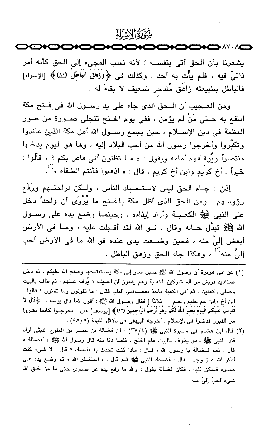 إذن: جاء الحق ليس لاستعباد الناس، ولكن لراحتهم ورَفْع رؤوسهم. ومن الحق الذي أظل مكة بالفتح ما يُرْوَى أن واحداً دخل على النبي صَلَّى اللَّهُ عَلَيْهِ وَسَلَّم َ الكعبة وأراد إيذاءه، وحينما وضع يده على رسول الله صَلَّى اللَّهُ عَلَيْهِ وَسَلَّم َ تبدَّل حاله وقال: فوالله لقد أقبلت عليه، وما في الأرض أبغض إليَّ منه، فحين وضعت يدي عنده فوالله ما في الأرض أحب إليَّ منه، وهكذا جاء الحق وزهق الباطل.