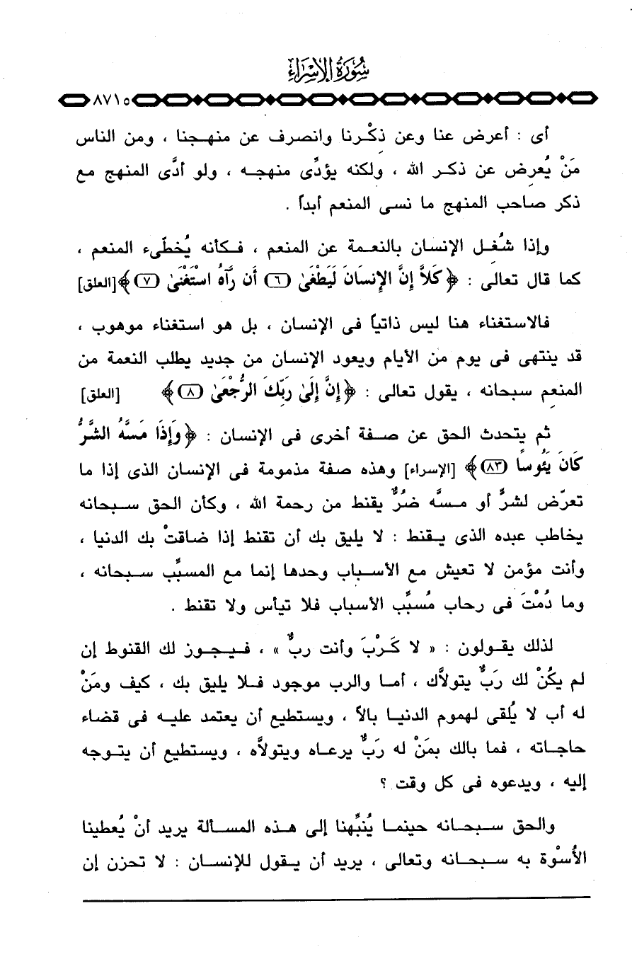 ثم يتحدث الحق عن صفة أخرى في الإنسان: {وَإِذَا مَسَّهُ الشر كَانَ يَئُوساً} [الإسراء: 83] وهذه صفة مذمومة في الإنسان الذي إذا ما تعرّض لشرٍّ أو مسَّه ضُرٌّ يقنط من رحمة الله، وكأن الحق سبحانه يخاطب عبده الذي يقنط: لا يليق بك أن تقنط إذا ضاقتْ بك الدنيا، وأنت مؤمن لا تعيش مع الأسباب وحدها إنما مع المسبِّب سبحانه، وما دُمْتَ في رحاب مُسبِّب الأسباب فلا تيأس ولا تقنط.