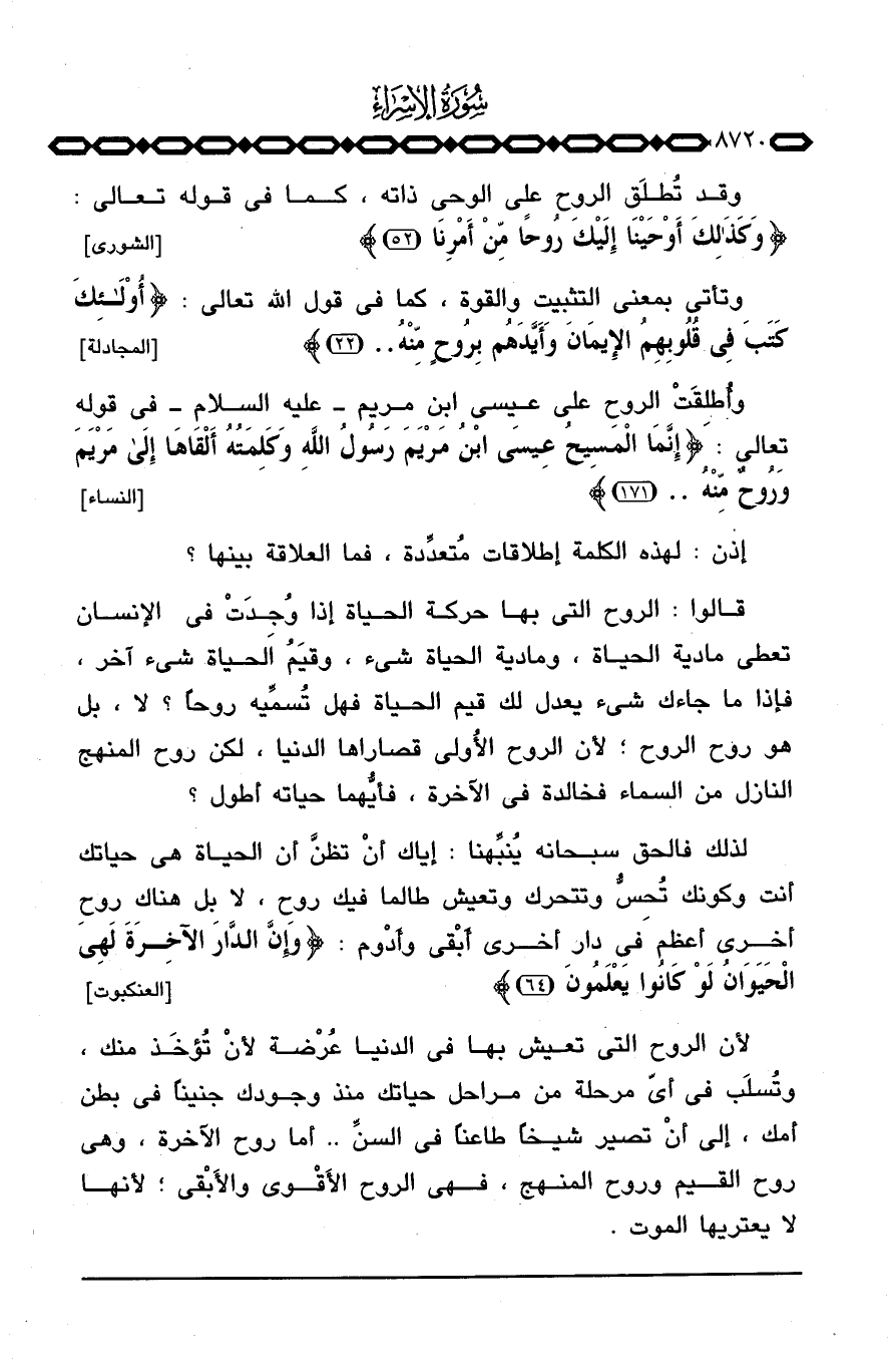 قالوا: الروح التي بها حركة الحياة إذا وُجِدَتْ في الإنسان تعطي مادية الحياة، ومادية الحياة شيء، وقيَمُ الحياة شيء آخر، فإذا ما جاءك شيء يعدل لك قيم الحياة فهل تُسمِّيه روحاً؟ لا، بل هو روح الروح؛ لأن الروح الأُولى قصاراها الدنيا، لكن روح المنهج النازل من السماء فخالدة في الآخرة، فأيُّهما حياته أطول؟