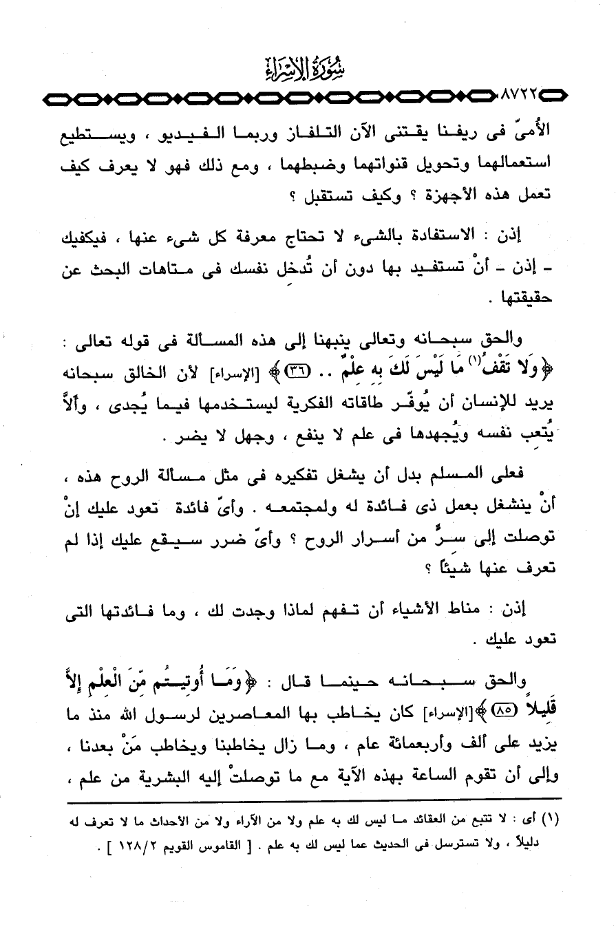 فعلى المسلم بدل أن يشغل تفكيره في مثل مسألة الروح هذه، أنْ ينشغل بعمل ذي فائدة له ولمجتمعه. وأيّ فائدة تعود عليك إنْ توصلت إلى سِرٍّ من أسرار الروح؟ وأيّ ضرر سيقع عليك إذا لم تعرف عنها شيئاً؟