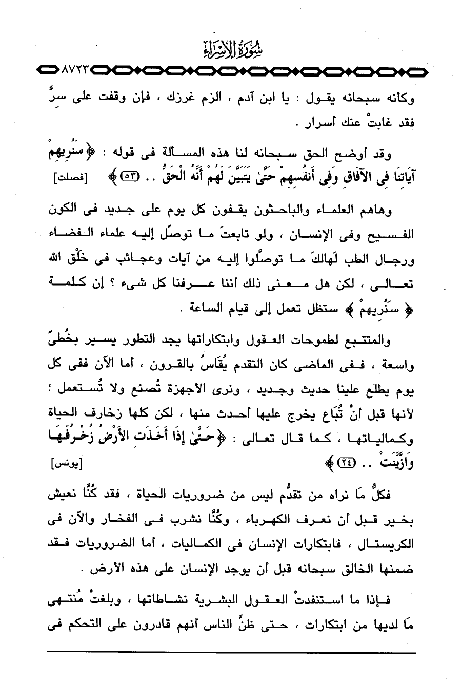 وهاهم العلماء والباحثون يقفون كل يوم على جديد في الكون الفسيح وفي الإنسان، ولو تابعتَ ما توصّل إليه علماء الفضاء ورجال الطب لَهالكَ ما توصَّلوا إليه من آيات وعجائب في خَلْق الله تعالى، لكن هل معنى ذلك أننا عرفنا كل شيء؟ إن كلمة {سَنُرِيهِمْ} ستظل تعمل إلى قيام الساعة.