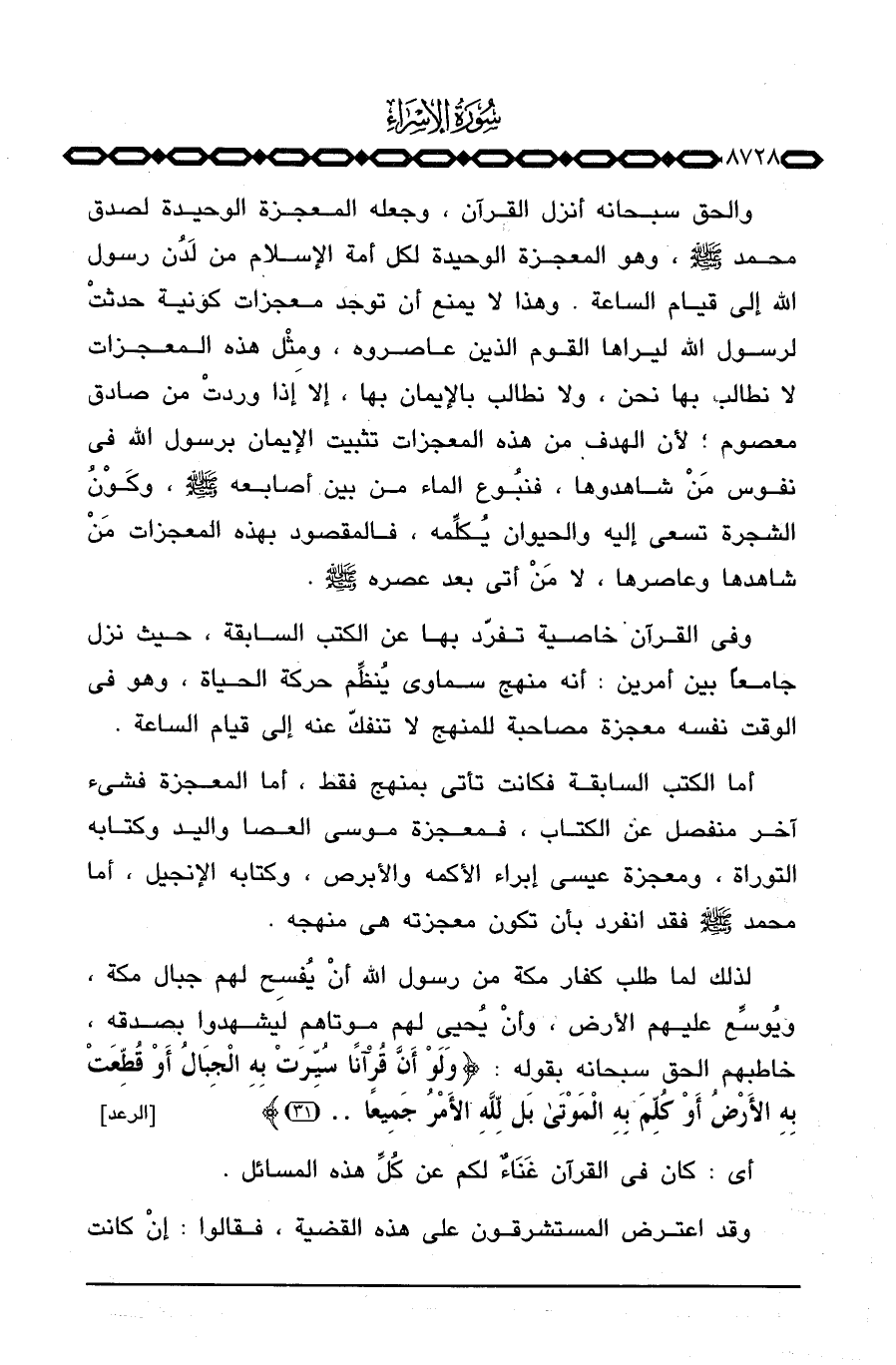 أما الكتب السابقة فكانت تأتي بمنهج فقط، أما المعجزة فشيء آخر منفصل عن الكتاب، فمعجزة موسى العصا واليد وكتابه التوراة، ومعجزة عيسى إبراء الأكمة والأبرص، وكتابه الإنجيل، أما محمد صَلَّى اللَّهُ عَلَيْهِ وَسَلَّم َ فقد انفرد بأن تكون معجزته هي منهجه.