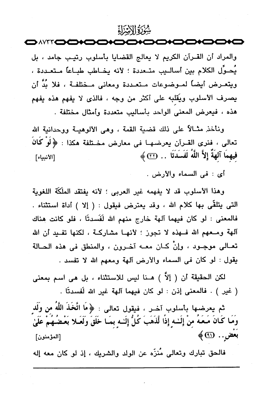 وهذا الأسلوب قد لا يفهمه غير العربي؛ لأنه يفتقد الملَكَة اللغوية التي يتلقّى بها كلام الله، وقد يعترض فيقول: (إلا) أداة استثناء. فالمعنى: لو كان فيهما آلهة خارج منهم الله لَفَسدتَا، فلو كانت هناك آلهة ومعهم الله فهذه لا تجوز؛ لأنها مشاركة، لكنها تفيد أن الله تعالى موجود، وإنْ كان معه آخرون، والمنطق في هذه الحالة يقول: لو كان في السماء والأرض آلهة ومعهم الله لا تفسد.